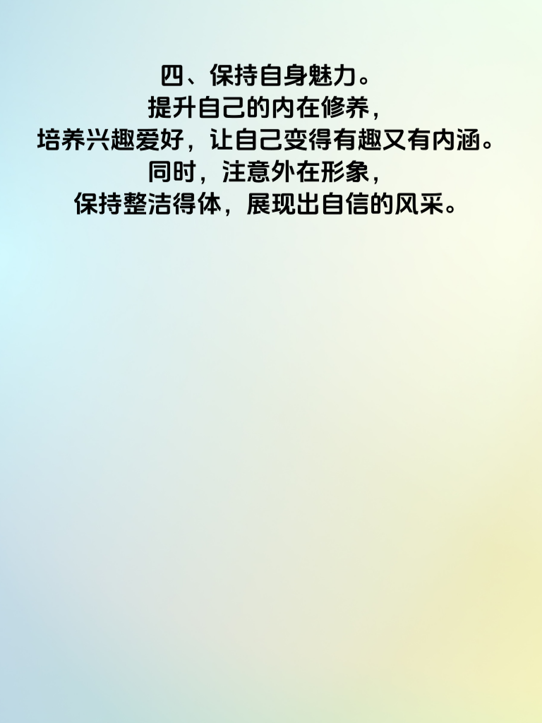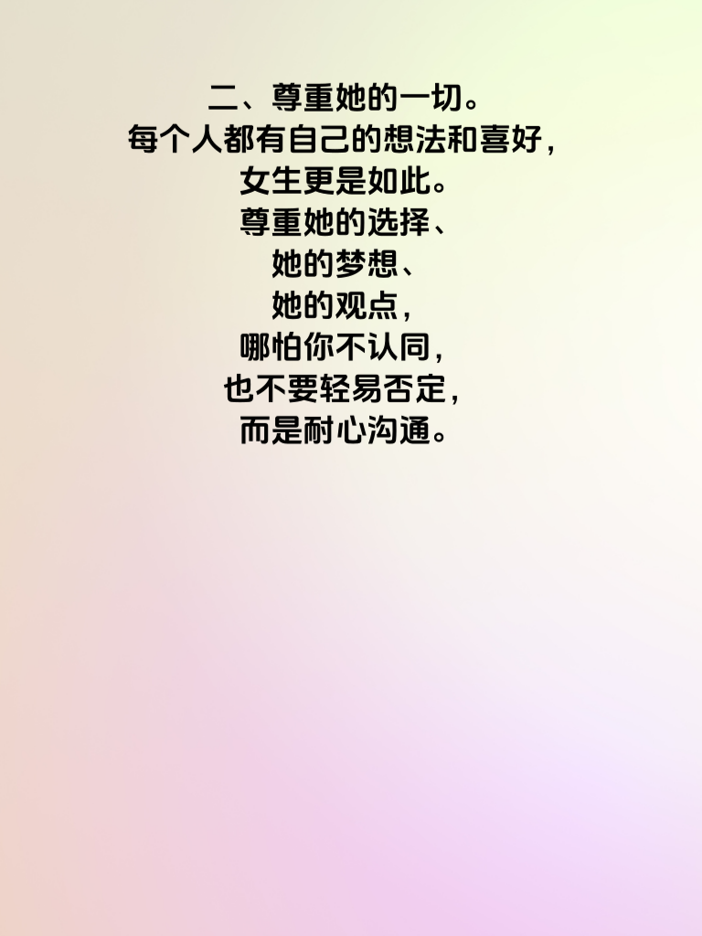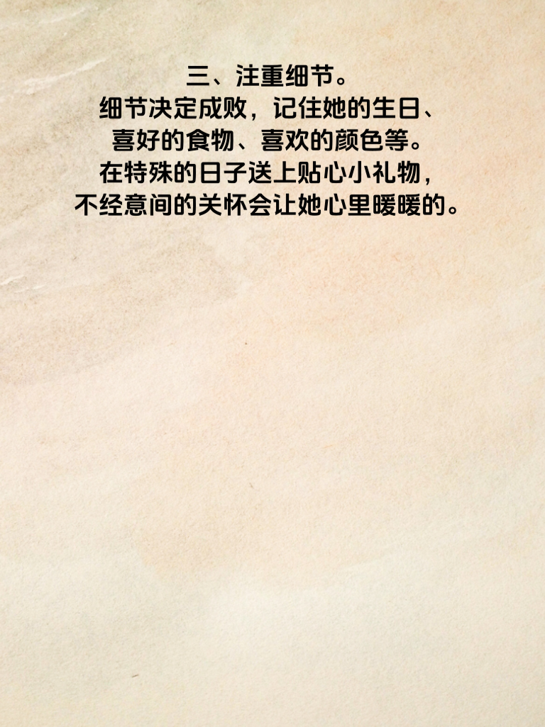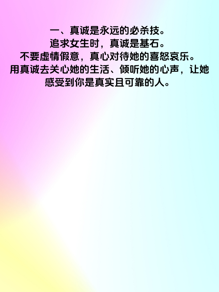 一、真诚是永远的必杀技。追求女生时,真诚是基石。不要虚情假意,真心对待她的喜怒哀乐。用真诚去关心她的生活、倾听她的心声,让她感受到你是真实且可靠的人。 二、尊重她的一切。每个人都有自己的想法和喜好,女生更是如此。尊重她的选择、她的梦想、她的观点,哪怕你不认同,也不要轻易否定,而是耐心沟通。 三、注重细节。细节决定成败,记住她的生日、喜好的食物、喜欢的颜色等。在特殊的日子送上贴心小礼物,不经意间的关怀会让她心里暖暖的。 四、保持自身魅力。提升自己的内在修养,培养兴趣爱好,让自己变得有趣又有内涵。同时,注意外在形象,保持整洁得体,展现出自信的风采。 五、给彼此空间。不要过度纠缠,给她足够的个人空间去做自己喜欢的事。这样她会更珍惜和你在一起的时光,也会觉得你善解人意。