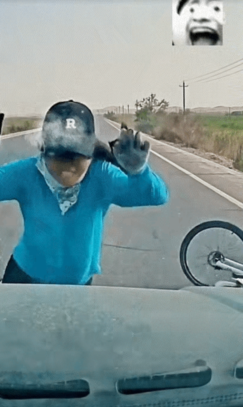 万万没有想到,这名女子听到背后有人按喇叭,情绪一下子激动起来,停下车之后,把自行车推到一边,快步的往回走,用双拳重重的砸在男子的汽车车头上,随后又对着自己的脸打耳光。