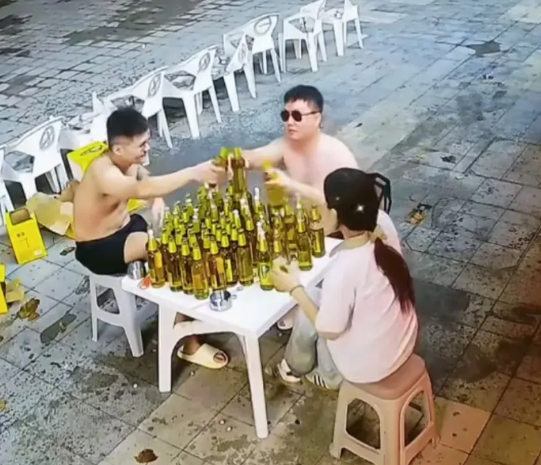 三人喝到兴奋时把桌上的啤酒挨个的都打开了,瓶里的啤酒由于压力就像喷泉一样,往天上冲,落到三人身上到处都是,后来女子可能是喝多了,退出了,蹲在路边看着两个男子继续拼酒。