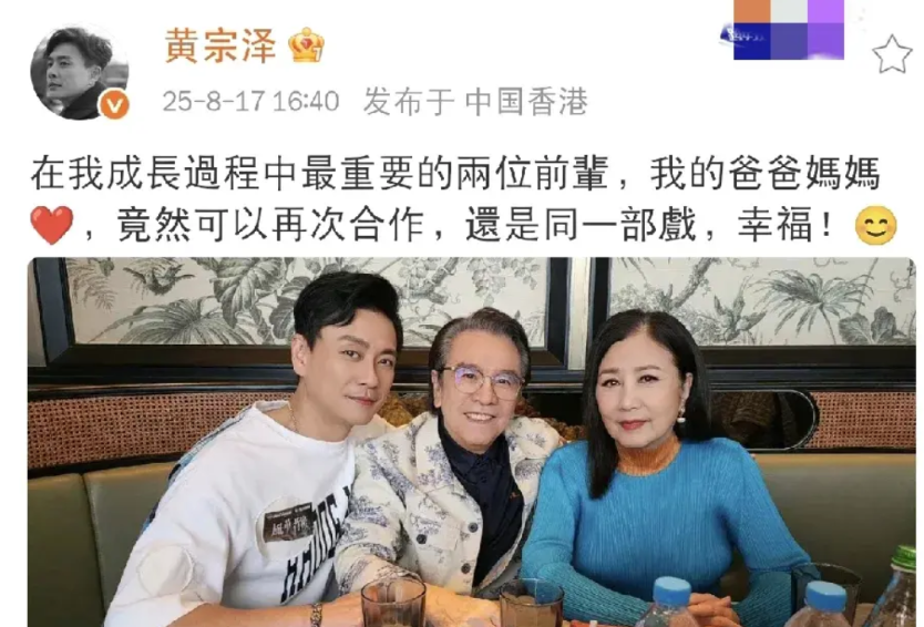 这次黄宗泽高调发文不仅晒出温馨全家福,更透露了罕见的工作安排——他与亲生父母共同参演同一部戏。