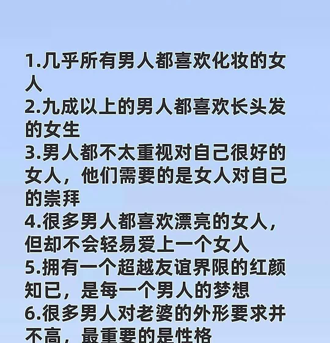 男人内心藏着不少小秘密。九成以上男人钟情长发女生,觉得短发女生少了韵味与温柔,多了阳刚气。男人是视觉动物,即便知道女生化了妆,也还是忍不住喜欢,毕竟“好色”是天性,就像女生看到帅哥也会多看几眼。 男人还喜欢被女生挑逗,主动的女生会让他们觉得特别。他们大多青睐懂得示弱、温柔的女子,这能激起他们的保护欲。而且,很多男人不在乎为女生花钱,但在意能否得到情绪价值,女生收到礼物后多表扬,会让他们很受用。最让男人上头的女生,外表柔弱,遇事却能处理好,还有丰富学识与高情商。