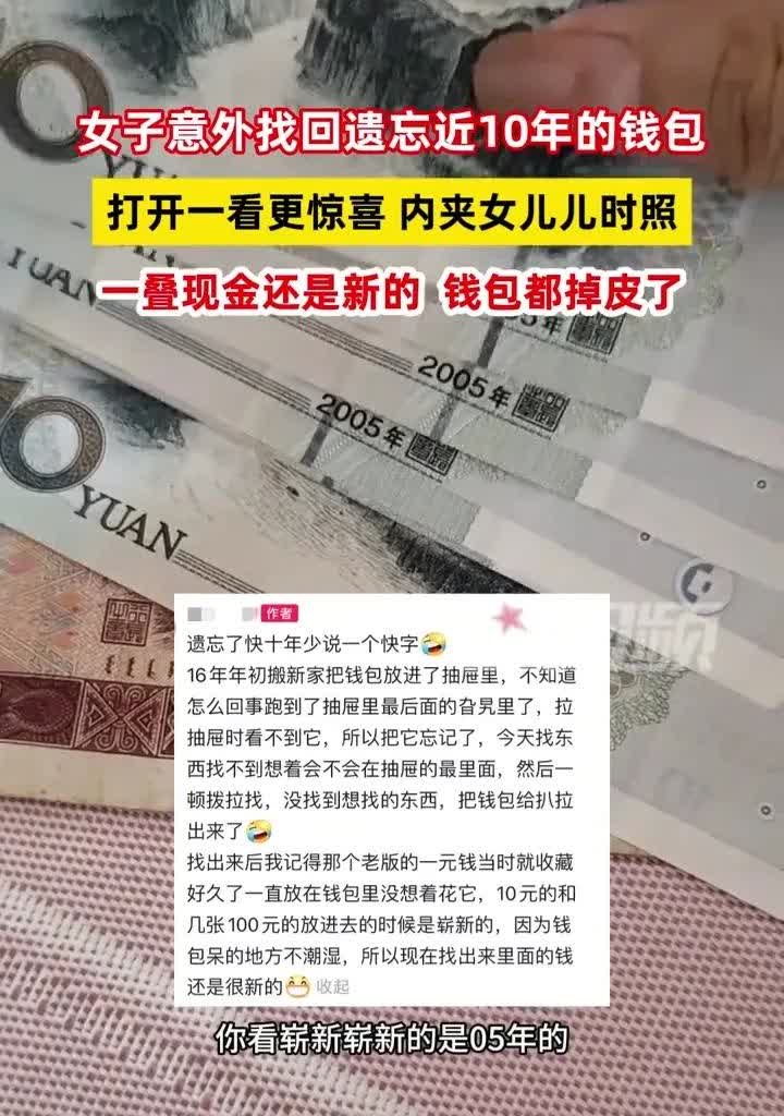 女子翻出有10年未曾相见的旧钱包,那钱包掉皮掉得不成样子,可里面的现金竟然崭新得如同刚放进去时一样!更为绝妙的是,还有一叠女儿小时候的照片,瞬间就让人破防了…… 这一番操作有谁能理解呢?10年都不花那些现金,还把照片贴身带着,这是念旧到了极点呢,还是太过“佛系”了?要是换做是你,会把旧物件留存这么久吗?