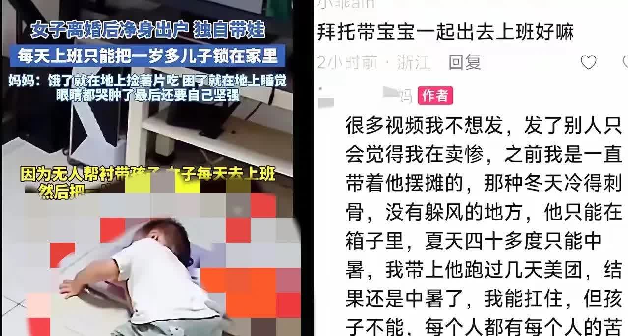 离婚后的女子,净身出户选择了把一岁多的孩子带走,而她上班孩子没人带,没人帮衬她,每天只能把孩子锁家里就去上班。 女子说每天上班看到手机里面的监控视频,孩子一个人在家耍,饿了吃薯片,困了就躺地上睡觉,没人搭理他,眼睛哭肿了都还要坚强。 有人曾劝女子把孩子带去上班,女子说之前冬天带过孩子去摆摊,冬天的风刺骨,孩子弱小身子根本就受不了,她拿个纸箱把孩子放进去,这样就会暖和多了。 夏天也带孩子出去过,但太阳大的把孩子晒中暑了。 女子没人帮忙,便出此下策才把孩子放在家里,自己一个人去上班。 单亲家庭的孩子真不易,尤其是单亲母亲带孩子,没有亲人的帮衬。 一方面得挣钱,不挣钱生活的日常都需要钱。 一方面还得带孩子,可又没人帮衬,女子才选择了把孩子放家里去挣钱,这种选择是两不误。 曾经我妈也是这样的,她刚20岁生下我,我大概半岁多时,叫院里的婆婆看,又怕长期麻烦别人,所以我妈出去做农活时,一去就半天,而我没人看,这么小的孩子又不懂什么干不干净,饿了还抓屎吃。 我妈没有离婚,而是我爸在单位上班,她年龄也不大,我又是她第一个孩子,没有经验带,所以我小时候受过没人带的苦。 只有孩子没人带的母亲,才能感受到女子现在的艰难,女子把视频发网上,很多人都说自己曾经也有这样的经历。