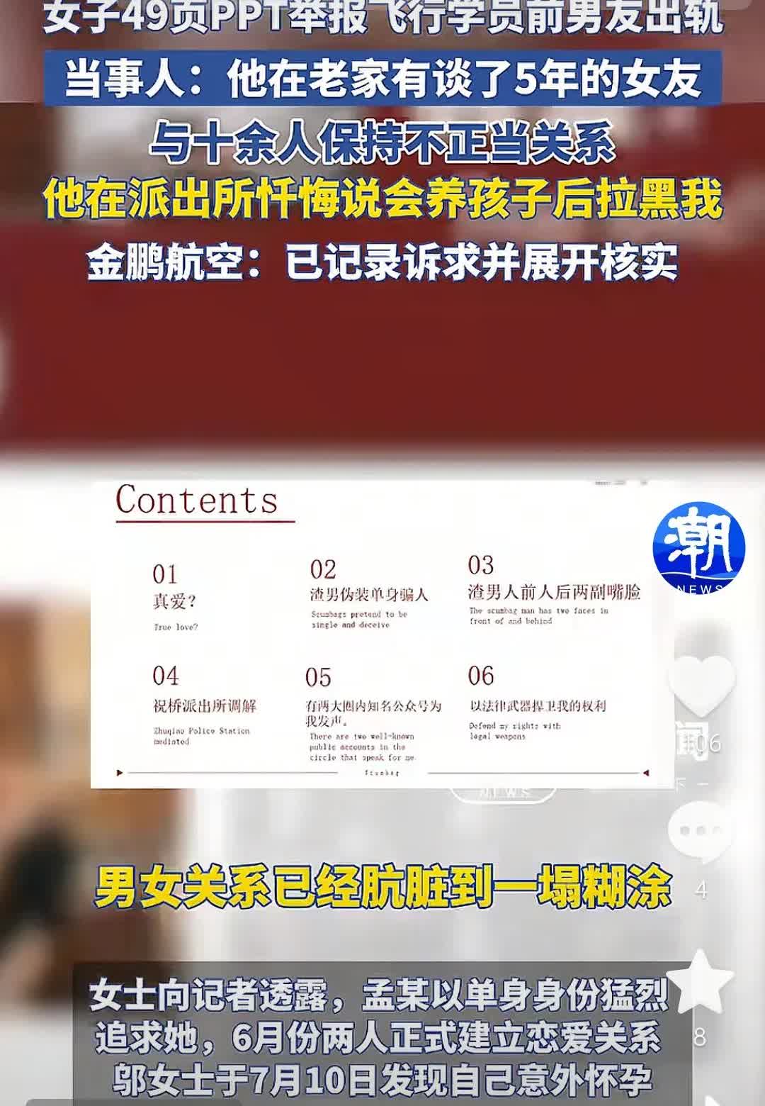 女子这手太飒了!上海邬女士被飞行学员前男友“渣”到窒息——老家有谈5年女友,恋爱期间还和十余人乱搞,自己意外怀孕后,对方派出所假意忏悔养孩子,转头就拉黑。她直接甩出49页PPT硬刚,从“渣男伪装单身”到“法律维权”,逻辑清晰怒锤恶行,连圈内公号都为她发声 。 遇出轨不妥协,邬女士用PPT摆证据、撕真相,把渣男丑事摊在阳光下。金鹏航空已启动核实,坐等后续结果。这事儿也警醒大家:感情里碰渣男别惯着,该维权就硬刚,真心不能被糟践!邬女士这波果敢操作,简直是“反渣教科书”,爽到飞起,必须给她撑腰!