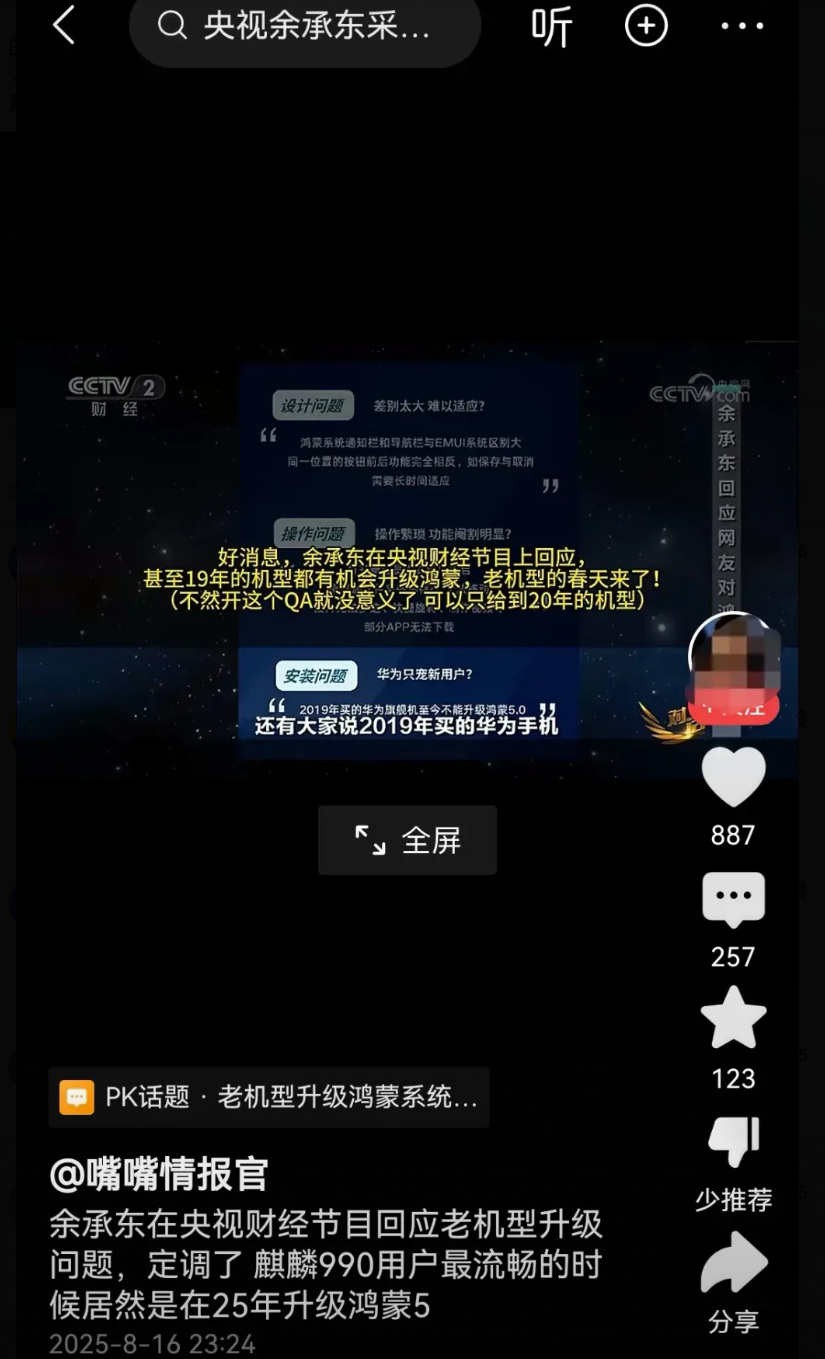 华为老用户特大好消息:近日余承东在央视专访中透露,华为对目前2-3亿华为旧机型老用户升级纯血鸿蒙系统已有计划安排。 甚至包括2019年以来购买华为手机的用户都能升级到纯血鸿蒙系统。 他声称,升级到纯血鸿蒙系统后,系统运行更丝滑更流畅更简洁。 因为纯血鸿蒙架构避免了app不断弹窗狗皮膏药似的广告,用户体验更好。 是我2020年买的Mate30。 已经使用快5年了,目前系统版本是鸿蒙4.2。 一旦华为开放Mate30升级到纯血鸿蒙,我会毫不犹豫地选择升级到纯血鸿蒙系统。 华为纯血鸿蒙现在需要居尽快让老用户升级到纯血鸿蒙,才能助推生态快速扩展! 余承东有说了,目前的纯血鸿蒙也有缺点,就是系统和纯血鸿蒙app功能完善都有一个过程,现在肯定有一些不如意的地方。 我不担心这个问题。其实绝大多数人用到的常用功能就那么多,我愿意陪着鸿蒙一起长大变强。 鸿蒙系统已经是国之重器,广泛用于军工,金融,导航,政企和教育等行业。 鸿蒙系统已经成功,至少在中国大陆这片土地上,今后会成为不二选择!