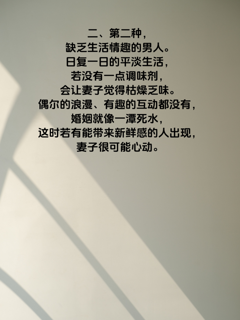 一、婚后,有些男人容易陷入被出轨的困境。第一种,长期忽视妻子情感需求的男人。他们一心扑在工作或其他事情上,对妻子的喜怒哀乐不闻不问。女人是情感动物,当她在婚姻里感受不到爱与关怀,就容易在他人那里寻求慰藉。 二、第二种,缺乏生活情趣的男人。日复一日的平淡生活,若没有一点调味剂,会让妻子觉得枯燥乏味。偶尔的浪漫、有趣的互动都没有,婚姻就像一潭死水,这时若有能带来新鲜感的人出现,妻子很可能心动。 三、还有一种,自身毫无上进心的男人。女人都希望自己的另一半积极进取,为家庭创造更好的未来。当男人整天浑浑噩噩,没有目标和追求,妻子会对婚姻失望,从而可能投向更有活力与希望的怀抱。男人要明白,婚后需用心经营,关注妻子,保持生活情趣,努力提升自己,才能让婚姻稳固,避免被出轨的悲剧发生。