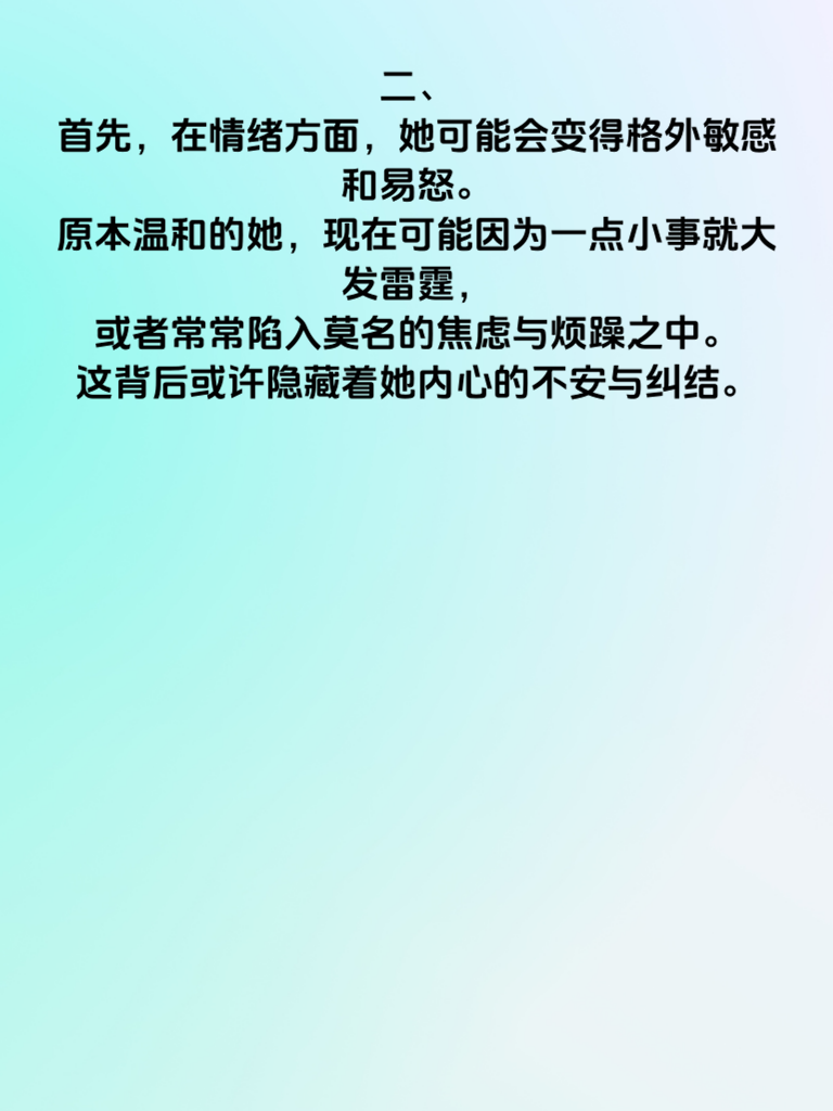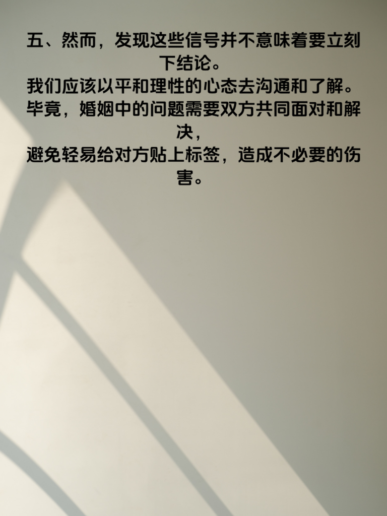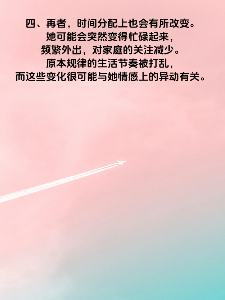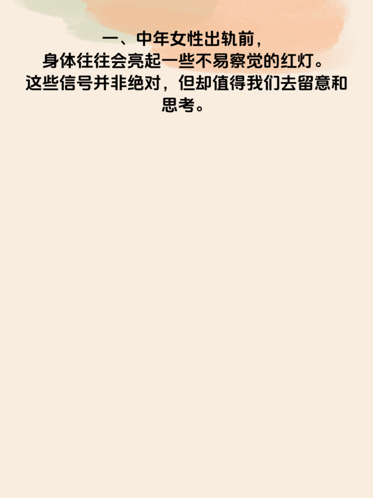 一、中年女性出轨前,身体往往会亮起一些不易察觉的红灯。这些信号并非绝对,但却值得我们去留意和思考。 二、首先,在情绪方面,她可能会变得格外敏感和易怒。原本温和的她,现在可能因为一点小事就大发雷霆,或者常常陷入莫名的焦虑与烦躁之中。这背后或许隐藏着她内心的不安与纠结。 三、其次,身体上的变化也不容忽视。比如,她可能开始注重外表,频繁购买新衣服、化妆品,精心打扮自己。这可能是为了在新的感情中展现更好的自己。 四、再者,时间分配上也会有所改变。她可能会突然变得忙碌起来,频繁外出,对家庭的关注减少。原本规律的生活节奏被打乱,而这些变化很可能与她情感上的异动有关。 五、然而,发现这些信号并不意味着要立刻下结论。我们应该以平和理性的心态去沟通和了解。毕竟,婚姻中的问题需要双方共同面对和解决,避免轻易给对方贴上标签,造成不必要的伤害。