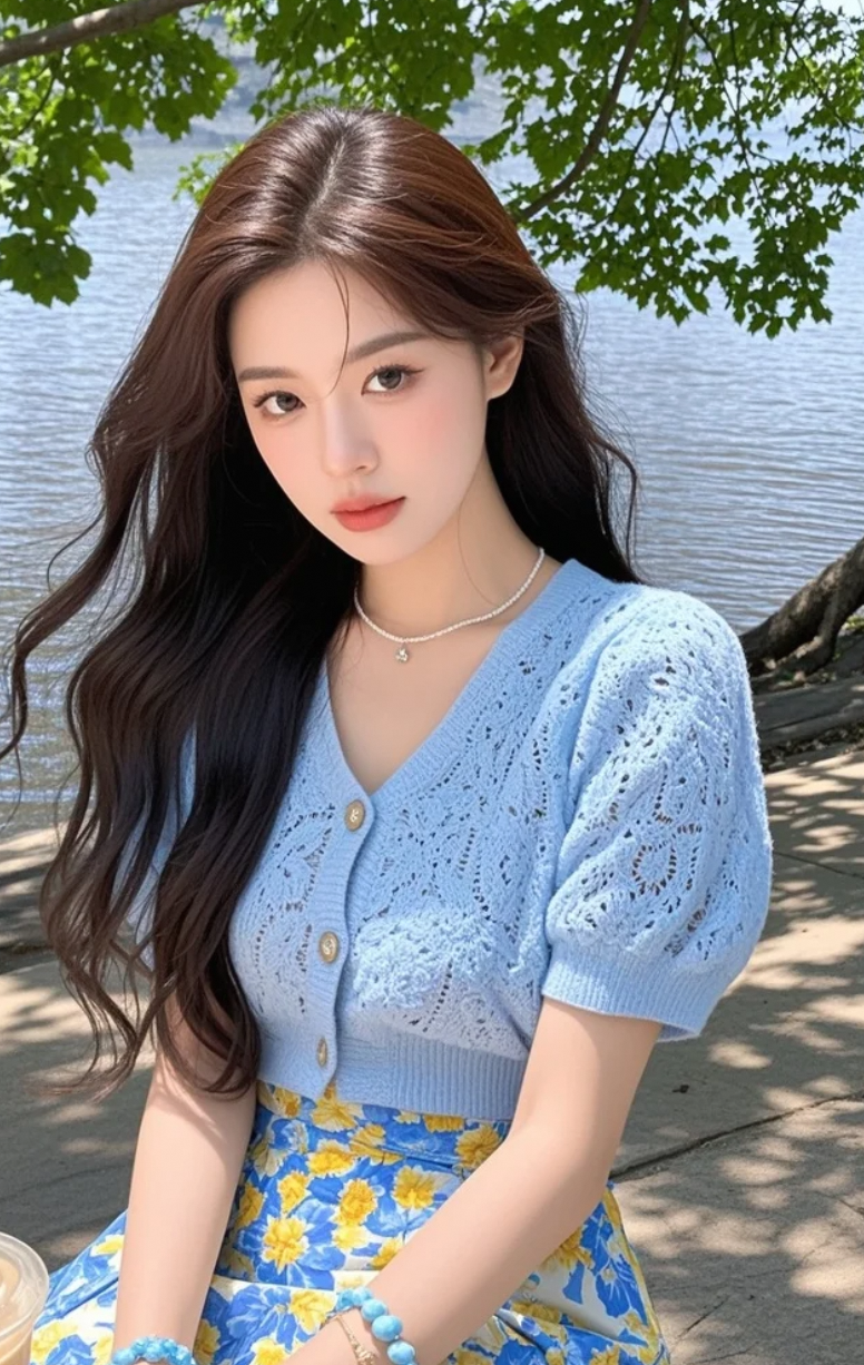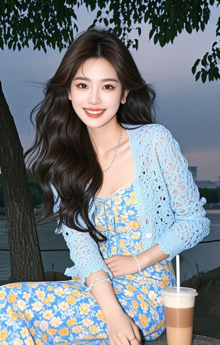 浅蓝色开衫与蓝黄长裙,在她身上碰撞出梦幻火花