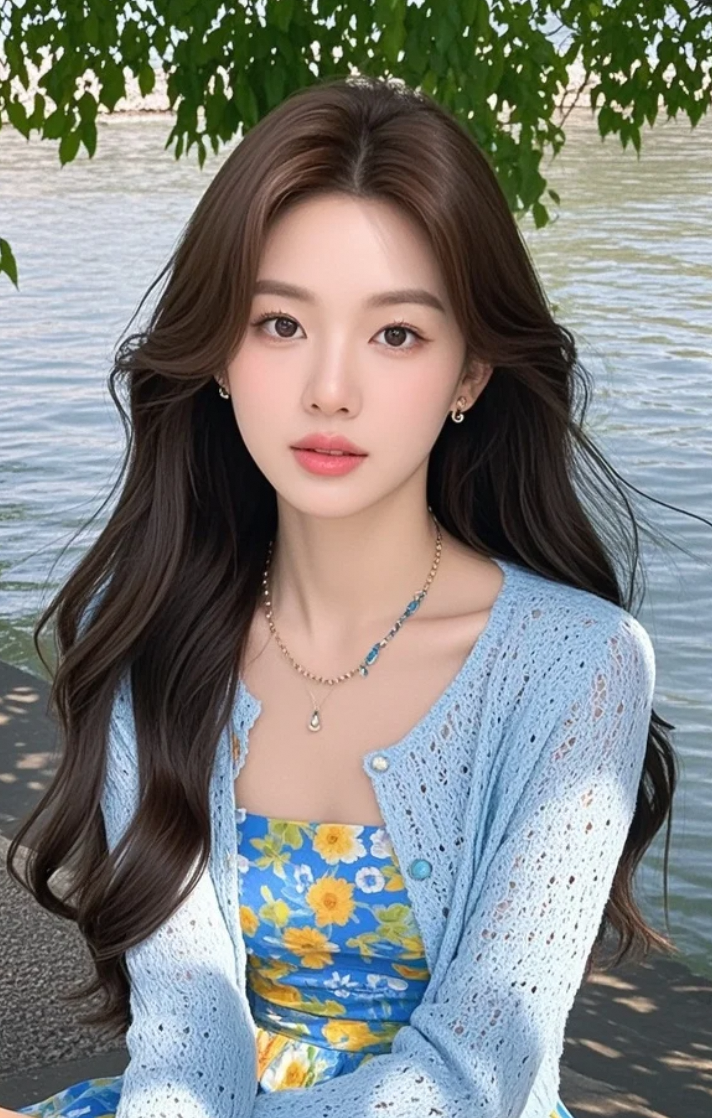 她在河边小憩,长发与裙摆随风轻舞