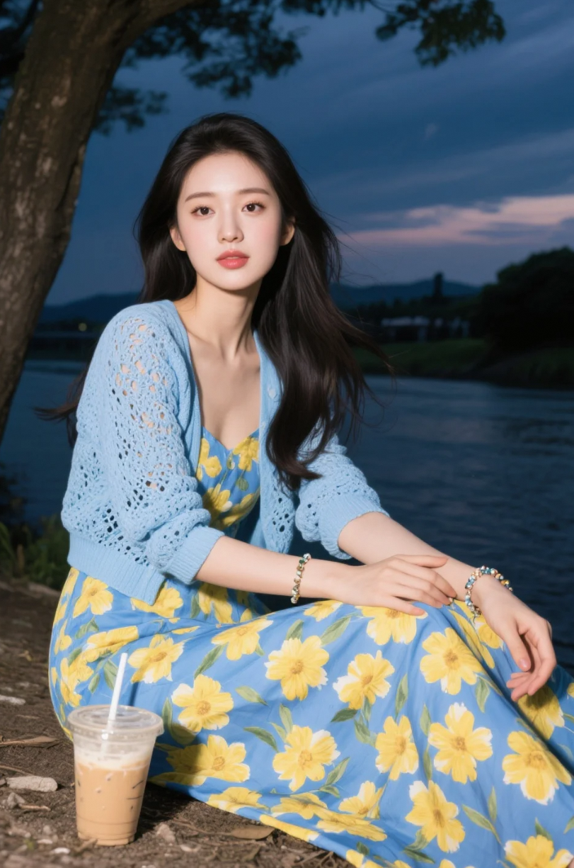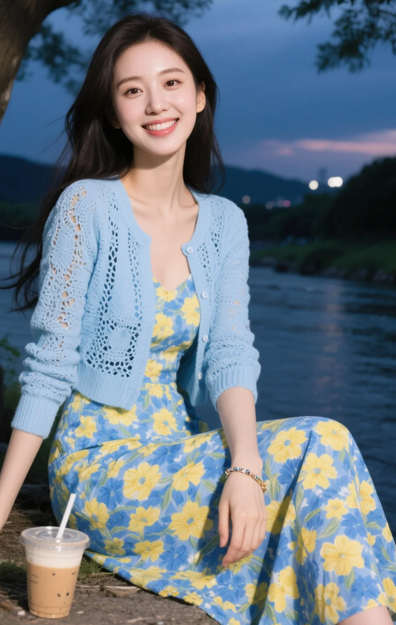 浅蓝色开衫与蓝黄长裙,在她身上碰撞出梦幻火花