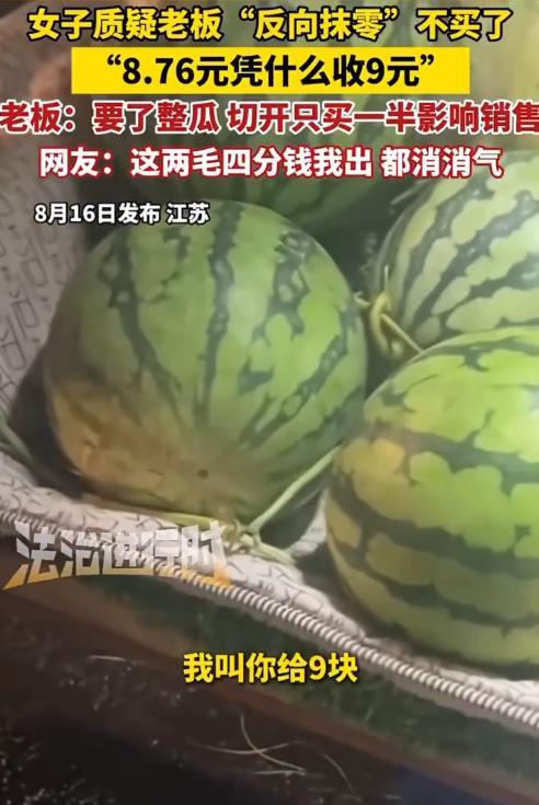 “有你这样做生意的吗?”江苏苏州,女子骑车回家时看到小区门口的西瓜不错,就要了半个,没成想,上秤后显示8块7毛6,摊主却张口就要9块钱,女子一听当场就不乐意了,哪有这样反向抹零的,而两人这一吵就是半个小时 本来在小区门口碰见卖西瓜的摊子,想着天气热,买半个解解暑,女子看着摊位上切开的半个西瓜,红瓤黑籽,新鲜诱人。她想着买半个回家解暑正好,便让摊主再切一个 电子秤"滴"的一声,显示8.76元。女子正要掏手机付款,摊主却开口说:"给9块吧,凑个整。" 女子愣住了。她本以为会听到"给8块5就行"这类话,没想到对方反而要加钱 女子觉得被算计了,表示如果不按实际价格就不买了。这下摊主急了:"西瓜都切开了你不要,让我卖给谁去?" 两人你一言我一语,争执逐渐升级。最后摊主竟拔走了女子三轮车的钥匙,还拿走了车上的水桶,不让她离开 有网友表示:现在都是手机支付几毛几分又不是给不出,反向摸零搞不懂,要是我我也不要 这话说得没错,严格来说,西瓜上秤显示8.76元,这就是交易的真实价格,摊主无权单方面要求顾客按9元支付。法律上叫“明码标价、按实结算”,卖方没有正当理由强行加价,否则就属于变相多收费 很多人买东西,不是只盯着价签,抹零往下让一点,是一种待人接物的方式,顾客记住的不是便宜了几毛钱,而是摊主的爽快 做买卖讲究的是回头客,讲的是长远。与其为了眼前这几毛钱闹得不愉快,不如把账算在人情里