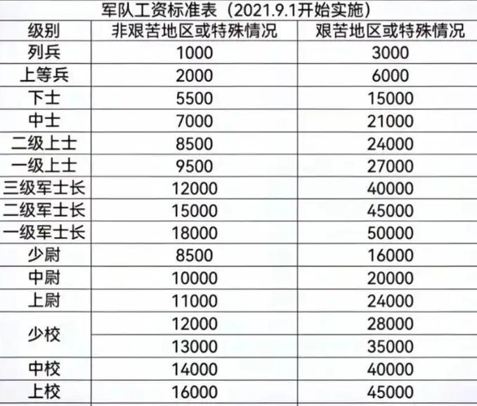 2021年9月后执行的军队工资标准: 如果只是单纯的当一个列兵,两年兵役是每月1000元的工资就退伍,确实少了点。义务兵服现役满两年后,自动晋升为上等兵。也就是说,想要晋升上等兵,需要退伍以后留队。只有留队以后的士兵,才会升级工资为2000元一个月。 工资确实不一样,要想拿当兵拿到高工资,必须得留队,而且还得留的时间越长越好,这也是必然的。但是想要留队,就必须得好好表现。只有到了下士水平,一个月拿5500元的水平,下士一般是班长的级别,那才是真正的高工资。 有些地方艰苦地区或特殊情况,工资要高得多。博主理解的艰苦地区和特殊情况,一般是位于青藏高原和新疆地区。这里确实非常的艰苦,尤其是中印边境线一带,那是最艰苦地区,而且随时可能会面临边境冲突。这边的官兵,拿最高工资是必然的,这是应该的。而新疆这边也是,边疆地区的官兵拿高工资,在新疆这边总体比较稳定,没有新没有西藏这边那么危险,这是事实。 所以不管怎么说,从2020年的加勒万河谷之战至今,一直坚守在边境地区的官兵,肯定要拿特殊情况和艰苦地区的工资,哪怕是列兵和上等兵,也是拿到3000和6000元的工资,这地方不仅是艰苦,还有危险。 从2010年以后,当兵工资就开始有了上涨了,因为提出一个目标,就是让当兵也能养得起家。那些超过25岁的士兵,可以结婚了,也可以留队。当兵至少五年以上了,到了结婚的时刻,而且还能靠工资养家,这就是咱们这边的宗旨,是绝对正确的。 留队又能保家卫国,还能养家,确实值得坚持。