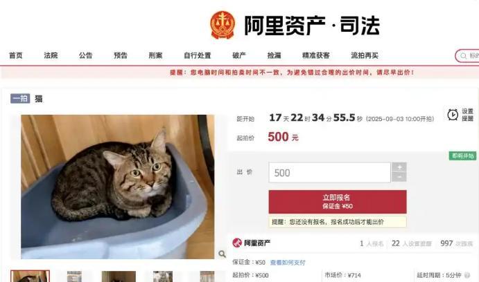 “笑不活了!”近日,江苏扬州,狸花猫的主人因债务问题,被法院执行,而猫则被法院以500元的价格拍卖还债!有人愿意出资8000元拍下,但由于已有数百人报名,竞拍者对此担忧起来。网友:最贵的一只狸花猫! 如今,有不少“老赖”因为不还钱被法院强制执行,名下的东西会被依法拍卖来还债,但大多数都是车、房子等值钱的东西,没想到,这次把猫都拿出来抵债了! 8月16日,有网友看到法院的一则拍卖消息,一只狸花猫将以500元的低价进行拍卖。 据工作人员介绍,这只公猫是2022年出生的,没过几个月其主任就因为债务问题被抓走,而猫作为名下财产则被先寄样在宠物店。 由于猫主人一直不肯还钱,现在法院对其名下的财产进行拍卖,而这只猫也没有逃脱。此前,猫在宠物店一年的寄养费就要1万多,但是被照顾的很好,打了疫苗,也没有生病。 工作人员表示这只猫可能并不值这个钱,但现在有很多人都在报名,估计拍卖时能够涨到三四千块钱,是她见过身价最高的狸花猫! 不少爱猫人士看到拍卖的消息后,纷纷围观,打算将无辜的小猫咪带回家。大家对于这件事是怎么看? 信息来源:《展开狸花猫竞拍者称想拿8000元工资拍下。》齐鲁壹点