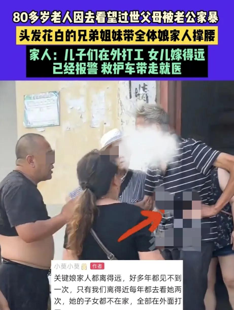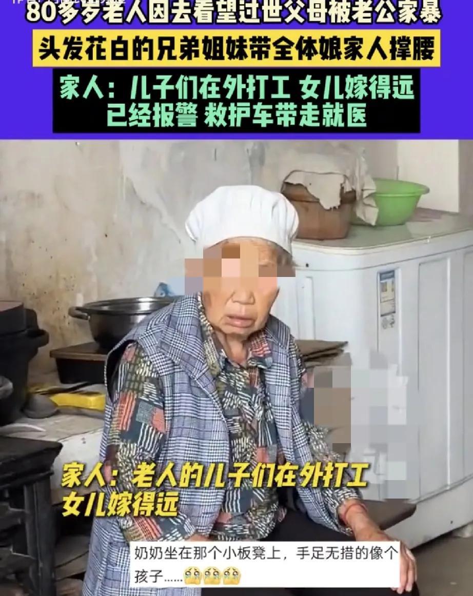 贵州一位80多岁老太,只因回了一趟娘家去看望过世父母,竟被其老伴家暴。可见,头发花白的老太眼睛被打得充血,牙齿也被打掉一颗,看起来非常让人心疼。但这一次的家暴,也让老太的娘家人彻底愤怒了,她的兄弟姐妹们纷纷站出来为其撑腰。 根据8月13日的报道。贵州一位80多岁的老太太因为是远嫁,所以从嫁过来就一直受气,有了孩子之后婆家才有所收敛。可是等到孩子们都长大外出工作之后自己的丈夫变本加厉,每天都是鸡蛋里面挑骨头。 尤其不愿意他回到娘家,认为她回去就是为了告状,渐渐地老太太一年也回不了一次娘家。 但是老太太到了这把年纪,心里始终记挂着已经过世的父母,想着趁自己这把老骨头还走得动,回娘家去看看,就当是跟在另一个世界的双亲唠唠家常。她怎么也没想到,就因为这么个再正常不过的念头,回家后会被老伴家暴。 那天,她满心感慨地从娘家回来,脸上还带着些对父母的思念与牵挂。可刚进家门,老伴却因为她回娘家这件事,瞬间怒目圆睁。没等老太太反应过来,拳头就落在了她身上。一顿打骂后,老太太惨极了,眼睛被打得充血,看东西都模模糊糊,嘴里还掉了一颗牙,疼得她直哆嗦。 往日里熟悉的家,这一刻却成了让她害怕的地方。 很快,老太太被家暴的事儿传到了娘家人耳朵里。她的兄弟姐妹们,虽说也都是头发花白的老人了,可得知妹妹遭遇这样的委屈,一个个瞬间愤怒起来。 这些兄弟姐妹,平日里各自过着日子,有的住得远,好些年都见不上一面,但血缘亲情让他们立刻行动起来,纷纷赶到老太太身边,要为她撑腰。 老太太的孩子们,儿子们都在外打工,女儿也嫁得远,没办法第一时间在身边护着她。要是没有这些娘家人,老太太遭遇家暴后,说不定只能默默流泪,独自承受痛苦。娘家人一来,气势就不一样了,他们要让施暴的人知道,老太太不是没人疼、没人管。 事情发生后,家人赶紧报了警,救护车也把老太太拉去就医。在医院里,老太太虚弱地躺着,脸上的伤看着就让人心疼。 那些赶来的娘家人,守在一旁,眼神里满是心疼和愤怒,心疼妹妹受了这么大罪,愤怒妹夫怎么能下得去这样的狠手。 这事儿在网上传开后,网友们也炸开了锅。 有人说:“老渣男将老妻视为奴婢,伺候他,照顾他,不允许老太婆有人类的感情去娘家,最后必然孤家寡人,孤独终老!” 这事儿也提醒大家,要多关注家里老人的生活。很多时候,老人的子女不在身边,他们遇到事儿,能依靠的就是亲人。 而且,家暴不分年龄,不管是年轻人还是老年人的婚姻里,一旦出现家暴都是不能被容忍的,都得重视,要让受害者知道,他们有地方可以寻求帮助,有人会为他们主持公道。 对于这件事情,你们怎么看?