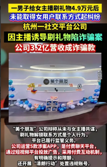 榜一大哥的权益有保障了。杭州一男子在一个社交平台上给女主播刷礼物4.9万,却没有要到联系方式,怒而报警。警方成立专案组,查封了办公场所,带走十几名员工进行调查,认定这家公司营收3.2亿属于诈骗。