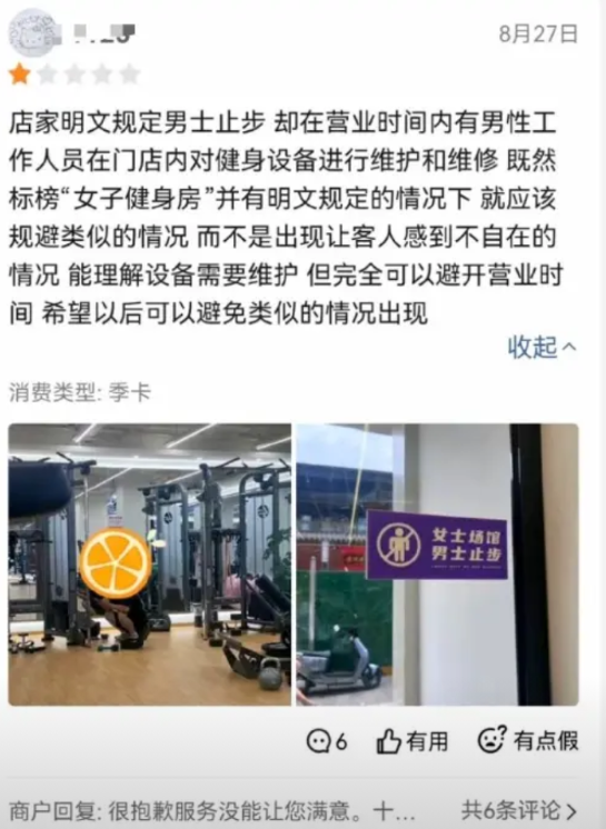 全女健身房,被女人差评、举报。 一个标榜全女健身房,因为设备维修让男性维修人员实