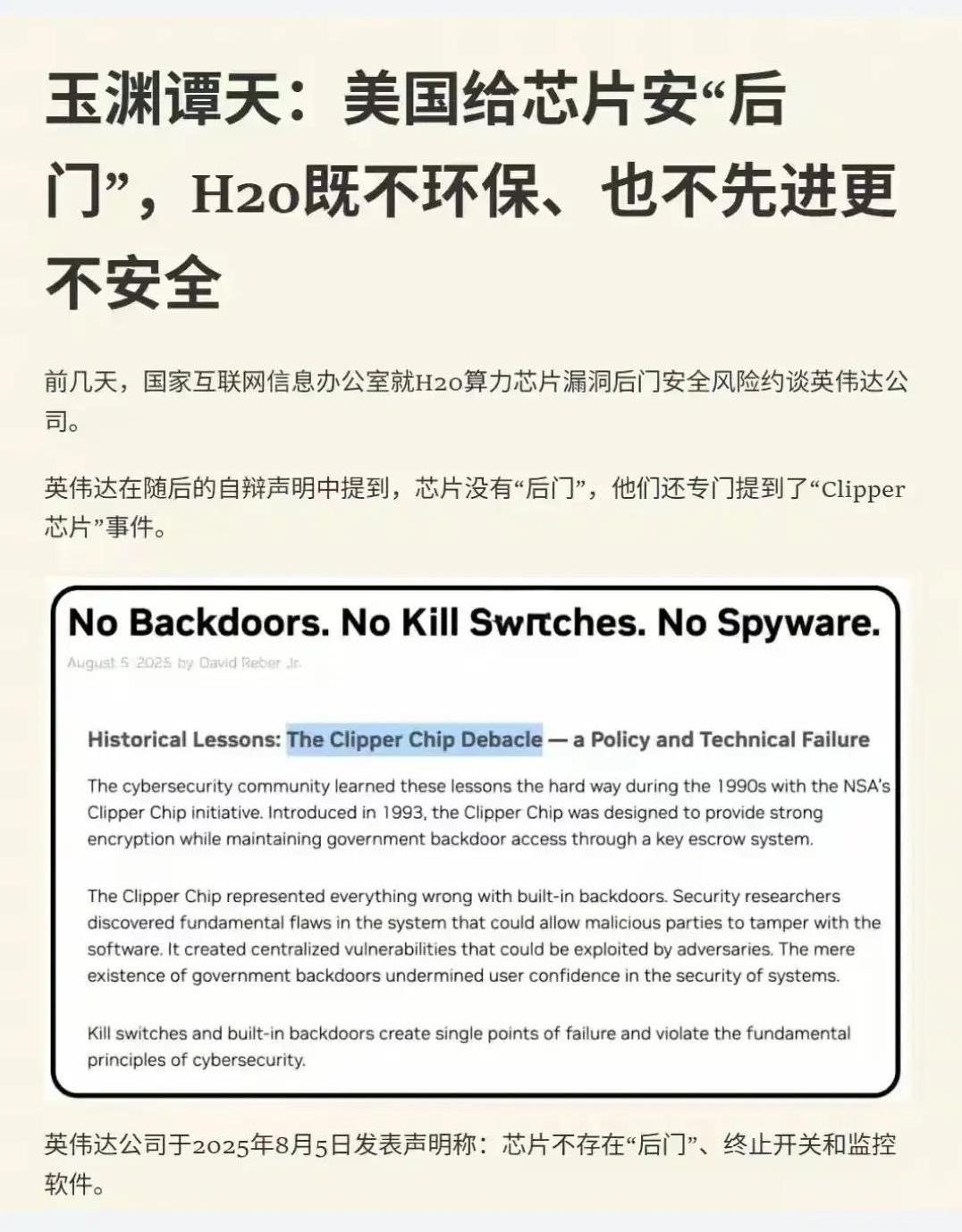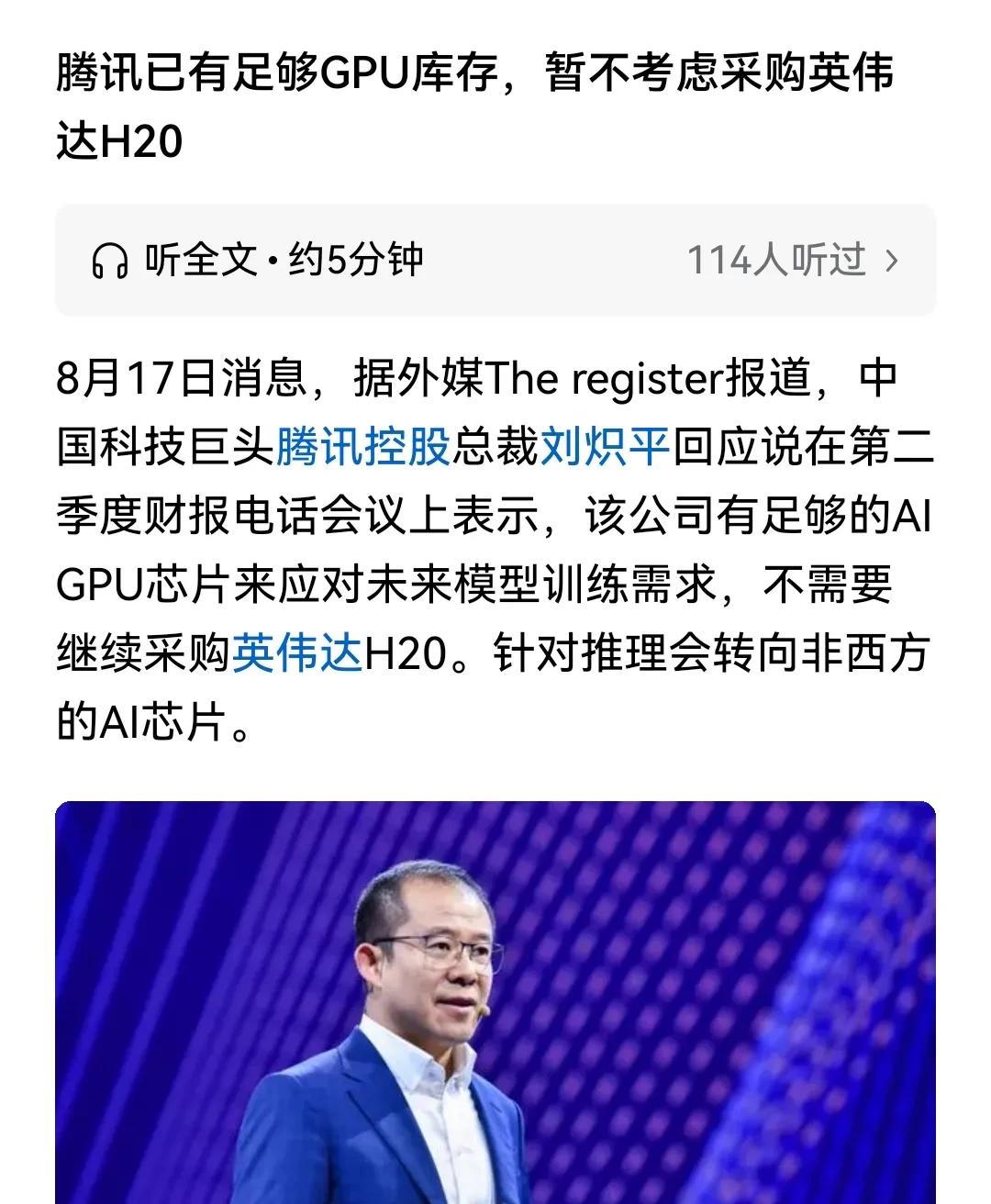 坚决不能买,腾讯好样的! 中国国家网信办针对英伟达H20芯片安全的质疑,效果终于出来了! 官方的意见,英伟达H20芯片有后门,既不环保,也不先进,更不安全。 现在腾讯已经表态不买H20芯片,其它的芯片需求大户们赶紧表态,一定要堵住H20这个炸弹进入。选择国产芯片,支持国产芯片,大家一起助力!