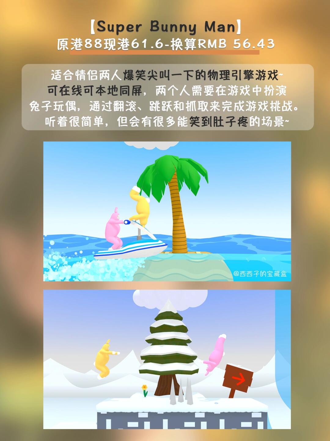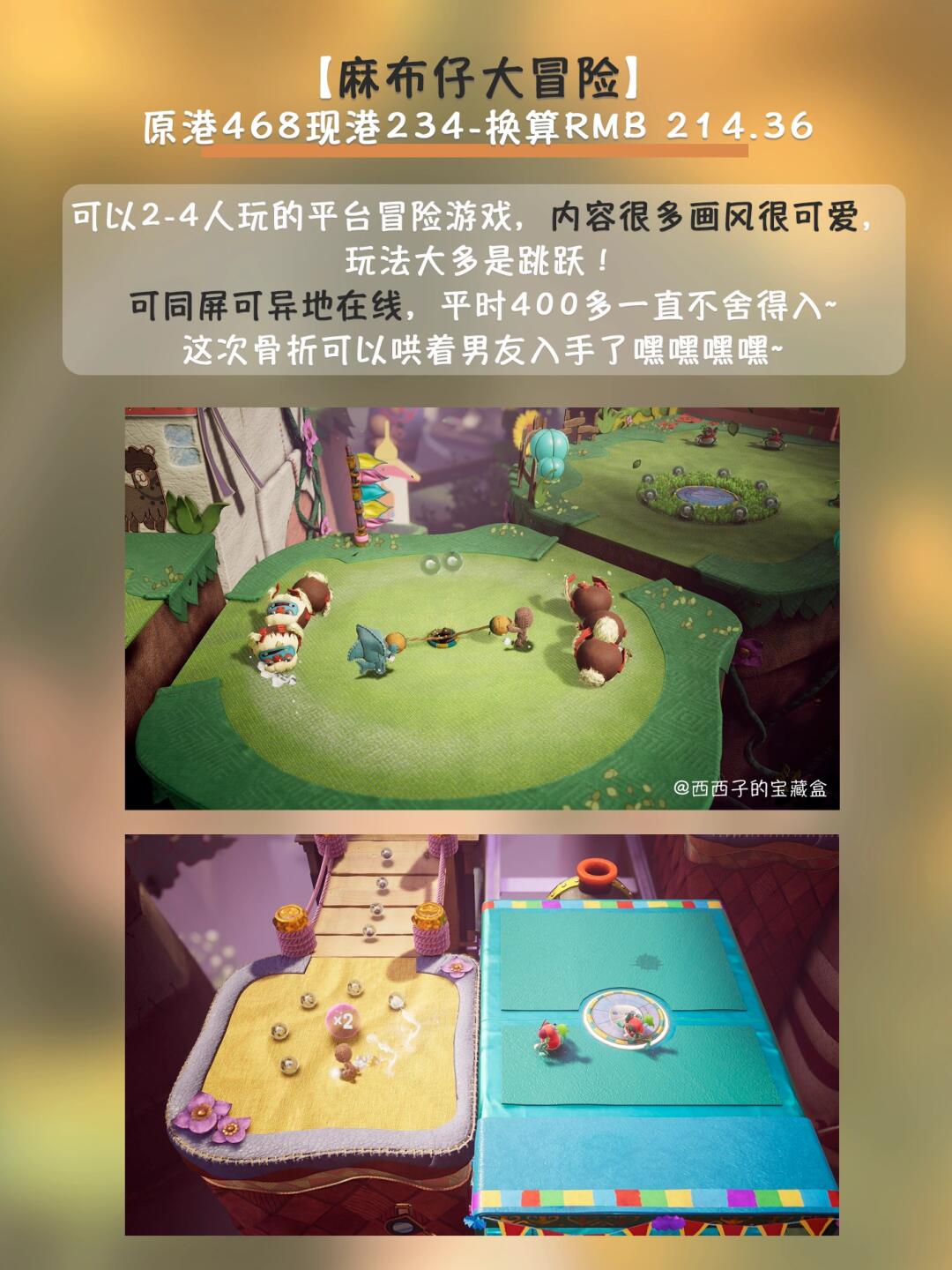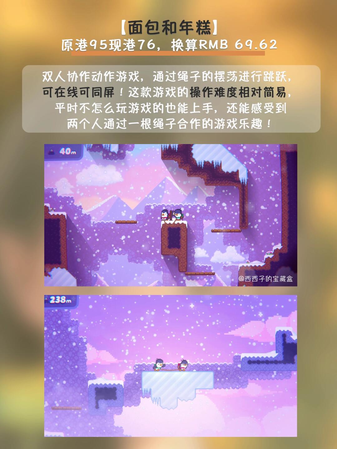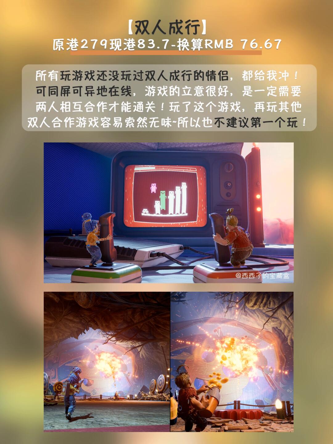 ❤️巨好玩的双人情侣游戏,趁着秋促快🐎几个和对象一起玩~ ⚠️本次游戏价格参考港区(会比其他区贵一点), 虽各区价格均有不同,但折上力度相差无几噢~ [萌萌哒R]所以有想入的游戏,价格相对比还会低些~ 别问为什么不拿国区(😭因为国区游戏是在太少~) · ⚠️港区秋促时间点:11月21日-28日上午10点 · 👫《双人成行》 原港279,现港83.7,RMB 76.67 · 💓《麻布仔大冒险》 原港468,现港234,RMB 214.36 · 👫《Spiritfarer®》Farewell版 原港187,现港46.75,RMB 42.82 · 💓《We Were Here Forever》 原港113,现港67.8,RMB 62.11 · 👫《胡闹厨房 全都好吃》 原港275,现港110,RMB 100.77 · 💓《面包和年糕》 原港95,现港76,RMB 69.62 · 👫《Super Bunny Man》 原港88,现港61.6,RMB 56.43 · 💓《橡胶强盗: Rubber Bandits》 原港78,现港14.81,RMB 13.56