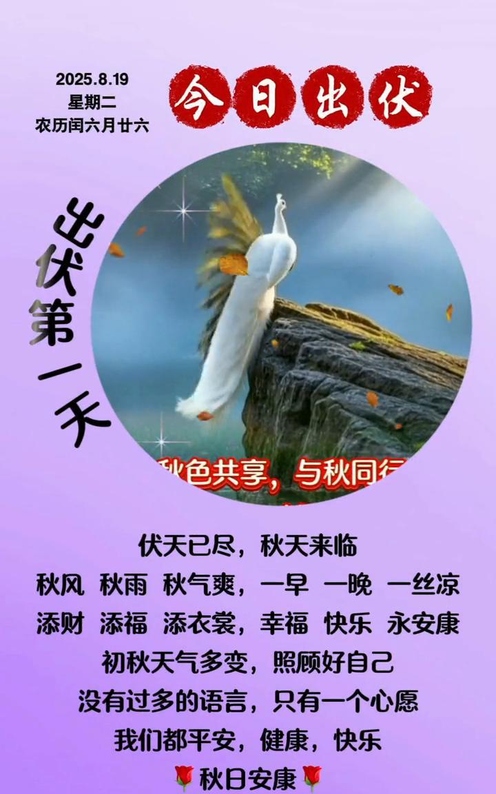 今日出伏。 农历闰六月廿六,出伏第一千。秋色共享,与秋同行。伏天已尽,秋天来临。秋风秋雨秋气爽,一早一晚一丝凉。添财添福添衣裳,幸福快乐永安康。初秋天气多变,照顾好自己。没有过多的语言,只有一个心愿。我们都平安,健康,快乐。秋日安康,健康,快乐。