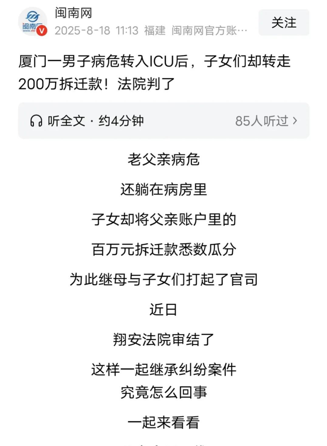 厦门,老父亲病危躺在ICU,女儿悄悄取走父亲200多万拆迁款,和2个兄弟瓜分,继