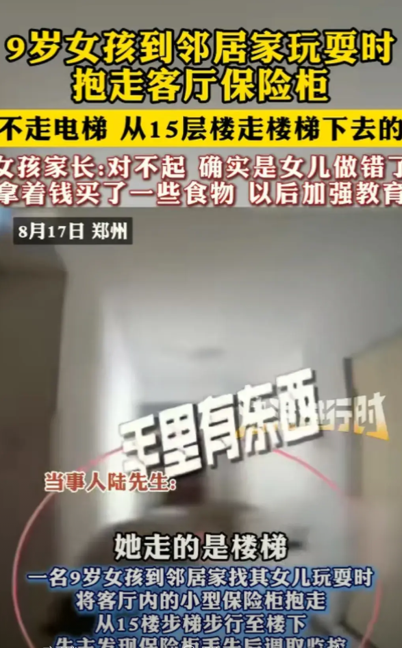太可怕了这智商如果不是做这种事那这智商绝对无敌了。近日,河南郑州。一个九岁女孩去15楼找小女孩玩时抱走客厅保险柜,她不坐电梯而从15楼走着下楼。