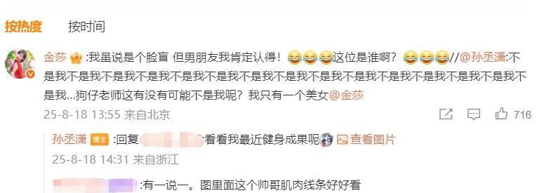 孙丞潇在线辟谣否认带美女出行后,有网友评论"图里面这个帅哥肌肉线条好好看",孙丞潇随即回应:"看看我最近健身成果呢",并直接晒出一张自拍,照片中他的肌肉线条非常明显。这种强烈的胜负欲让人忍俊不禁。