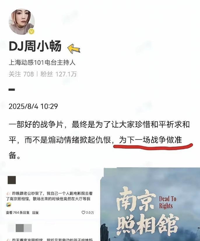 万万没想到,一部爱国电影《南京照相馆》竟让上海女主持人周小畅破防了,她痛心疾首指出:这部电影宣扬仇恨,为下一场战争做准备! 电影《南京照相馆》上映已经有一段时间了,大家对这部电影的评价都是好评如潮。 最适合让孩子来看,这才是我们真正经历过的历史,不少孩子在看完之后都是流着眼泪走出来的。 这就能够看出《南京照相馆》这部电影的成功,但是却总是有人对这部电影进行贬低。 而上海的一位女主持人周小畅更是指出,这部电影就是在为下一场战争做准备。 一部电影她竟然给出了这么高的评价,这是所有人都没有想到的结果。 电影和战争还能够扯上关系,电影的拍摄就是当时的历史,没有什么不能够看的。 对日本的仇恨是每个中国人心中都有的,因为这是我们曾经经历过的历史。 虽然日本对那段历史轻描淡写,甚至想要忘记,但是在中国没有人会忘记那段历史。 孩子们也应该彻底的了解那段历史,只有正视历史才会真正的看清历史的本质。 日本的侵华战争是我们真正经历过的,抗战胜利的时候据统计我国足足付出了3000万人的损失。 这是多么庞大的数字,南京更是每一位中国人心中的痛!这部电影让我们更好的铭记历史。 历史永远都不会改变,这就是现实,真的不理解女主持人周小畅到底是何居心。 能够和战争挂钩这或许是大家都没有想到的结果!
