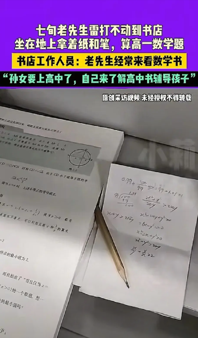 老人坦言自己基础差,一道题常要反复推导几小时,书店店员说,他总挑角落位置,怕影响别人,偶尔还会向路过学生请教。孙女并不知道爷爷的“秘密行动”,只发现他最近常问自己“函数难不难”。这种“笨拙”背后,藏着老一辈特有的浪漫,他们或许不懂现代教育理论,却愿用最原始的方式陪孩子成长。