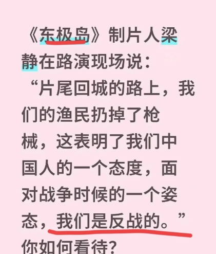 不知道大家如何理解管虎的老婆在电影《东极岛》的宣发上说的这样一句话:“中国人放下武器才是反战”? 说这话的女人叫梁静,是管虎的老婆,也是《东极岛》这部电影的制片人,对于电影有了解的人应该知道,制片人就是电影的制作者,所谓电影的最后解释权的拥有者。 梁静这番话,无疑是对电影主题的一个解释。 你是如何看梁静这句话的? 难道反战就要放下自己手中的武器吗?难道这不是赤裸裸地宣传投降吗?难道让中国人放下武器才是真正的反战吗? 请问西方讲反战都讲了几十年了,怎么没有看到任何一个西方国家放下武器啊? 如果中国人放下武器的话,那最高兴的是谁?
