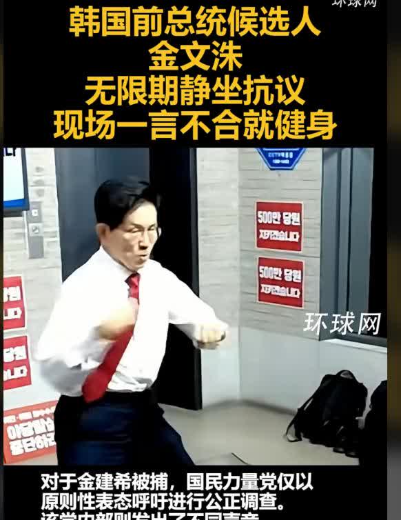 金建希被捕后,金文洙不乐意了,认为这是政治报复,是韩国宪政史上前所未有的暴行。目前,韩国前总统候选人金文洙开启了无限期静坐抗议。大家还记得尹锡悦时代,李在明绝食抗议的事情吗?金文洙似乎是借鉴了李在明的一些手段。但我认为这是画虎不成反类犬,属于东施效颦。因为李在明当初是绝食抗议,差点就饿死了。金文洙是静坐抗议,而且还不时起来健身。所以说,金文洙的表现痕迹更浓烈一些,不得不说,比起当初的李在明差远了!