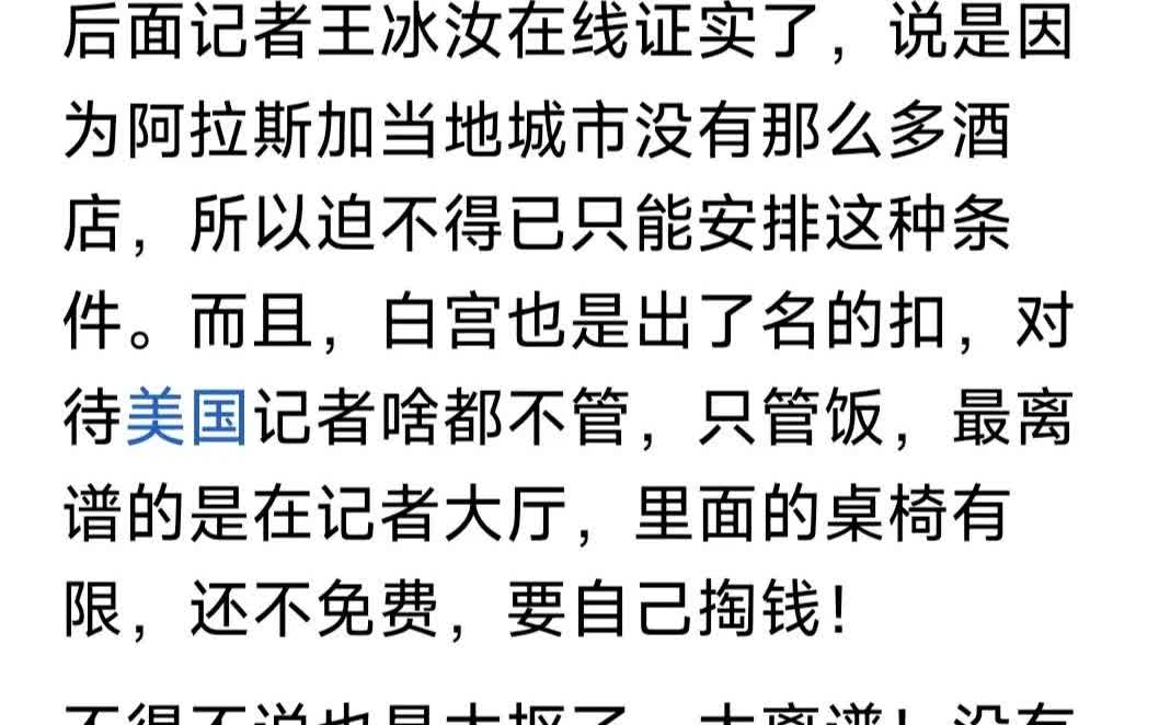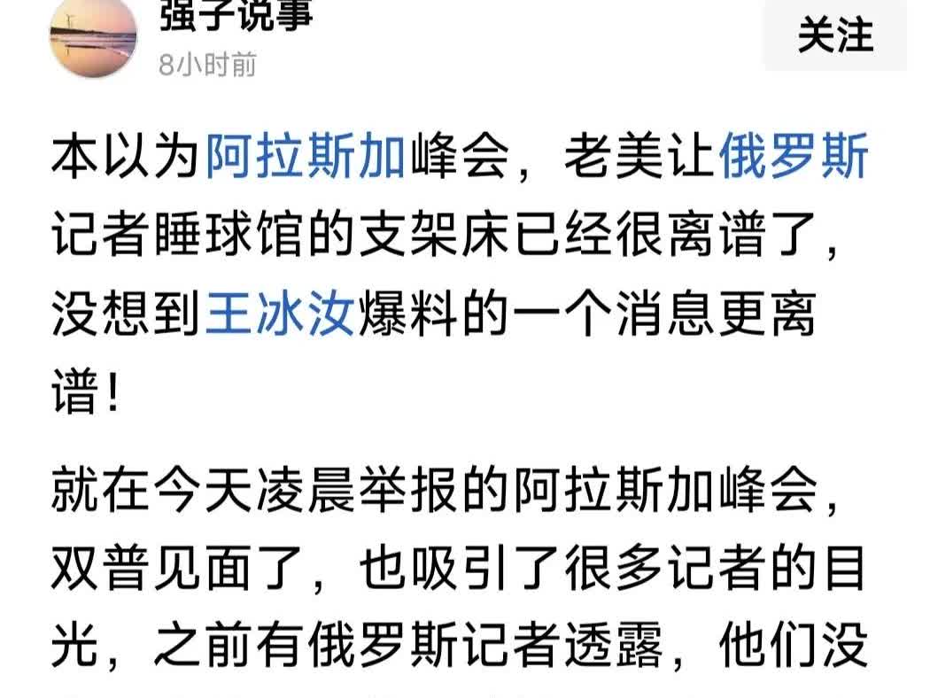 这次“特普会”,老美太“丢脸”!“三加三”会谈未达成任何协议,二人板着脸开罢新闻发布会,连安排的“共进午餐”都免了,各自“劳燕双飞”而去! 回想这次“特普会”安排,放着那些豪华大城市不去,偏偏选择地偏人稀阿拉斯加!还有“例行军演”,空中F-35伴飞猛禽F-22空中呼啸而过!啥意思? 尽管地偏人稀,还是爆发大规模示威,民众反对川普讨好普皇,出卖乌克兰!闹得会谈气氛不太“友好”!最重要是此时酒店紧张,无法接待众客人。 导致俄方包括记者在内,大量随行服务人员,只能睡在体育馆内的隔板间里,硬板单人床,空间狭小局促,没有通讯与洗浴设施,让人情何以堪? 更可气的是,川普政府抠得很!不仅对外国记者,对美国记者也是一样,除了吃饭啥都不管!连采访大厅里的桌椅板凳,都得记者自己付钱使用? 这就是全球最强超级大国,世界老大,世界警察,世界文明“灯塔”的待客之道吗?连全球最贫穷的非洲国家,也不至于如此“慢待”来访的客人吧? 当然也有另外解释:美国媒体属自营性质,记者不能消费纳税人的钱!至于当地酒店紧张,则因旅游旺季酒店客满,俄随行人员只能住体育馆了? …………