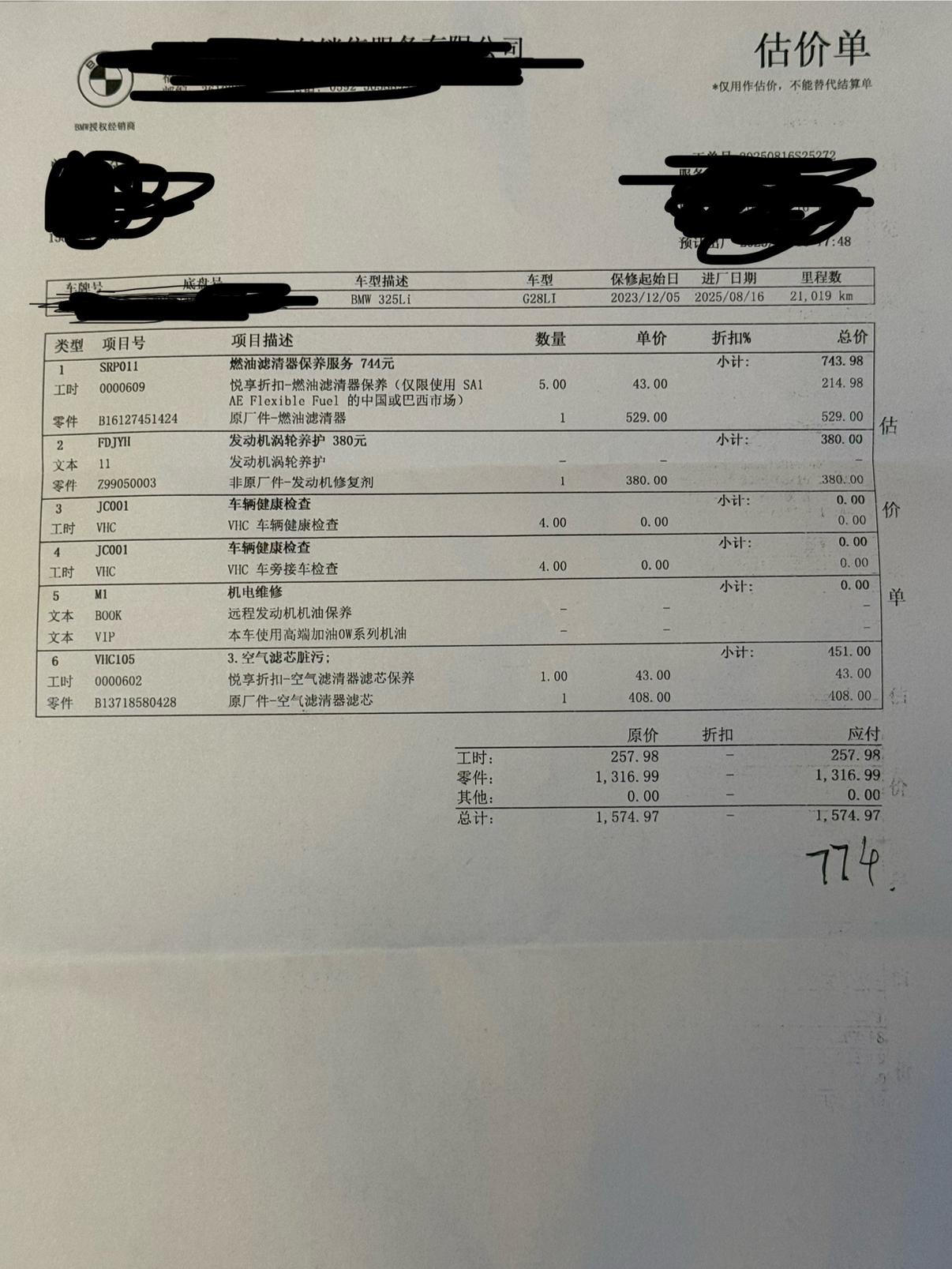 20000公里保养项目和费用,保险赠送800,剩下总共自付774。 4S店服务一般,洗个车跟没洗一样。宝马不仅产品力跟不上新势力,连服务都远远落后几个身位。