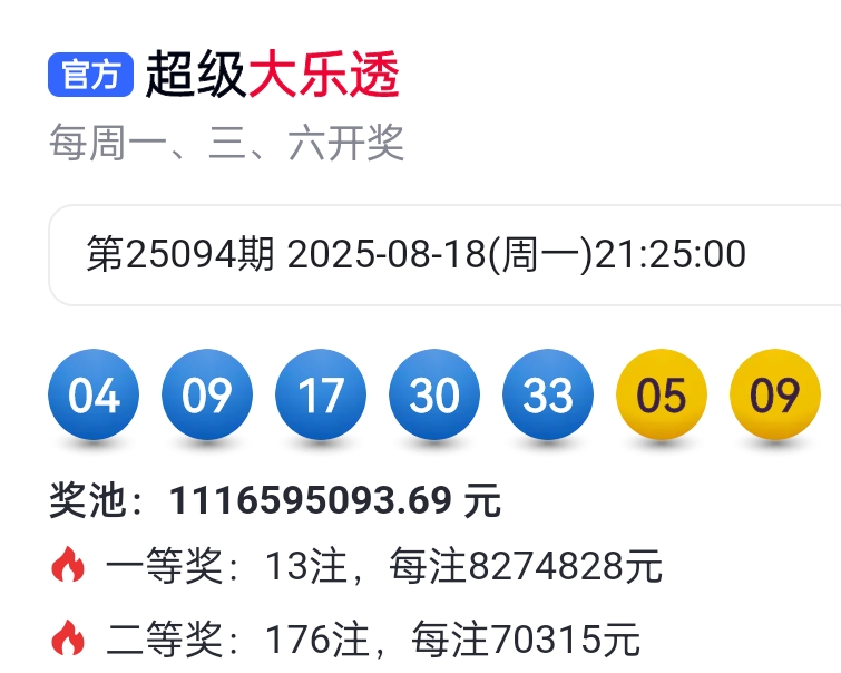 尊敬的各位朋友,今日大乐透25094期的开奖结果已正式揭晓。前区开出的号码为4、9、17、30、33,后区则是5与9的组合。 从三分区的走势进行分析,区间比为2:1:2,大小比为2:3,奇偶比为3:2。其中,9和30这两个号码为重号。后区的5和9均为奇数,且5呈现出三重号的走势。 一区开出了2个号码,首位号码4间隔1期后再次出现,9作为重号再度落下。二区仅开出1个号码17,呈现斜连号的走势。三区同样开出2个号码,30为重号回补,末位号码33间隔7期后重新出现。后区的5和9构成奇奇组合。 总体而言,本期开出的均为热号,且有三个重号落定。 本期一等奖共开出13注,单注奖金达827万元,且均未选择追加。这13注一等奖分布于不同地区,北京1注,河南1注,广东1注,江苏10注。倘若这13注奖金由一人所得,奖金总额将高达8270万元。 二等奖开出176注,单注奖金为7万元。其中,113注选择了追加,每注可额外多得奖金5.6万元。 #大乐透开奖结果# 再次衷心祝贺中奖的各位彩友,祝愿大家未来好运常伴,心想事成!