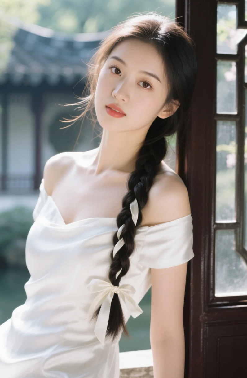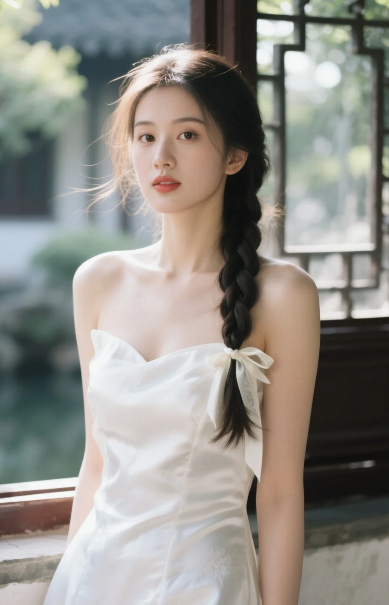 古典园林中的一抹清新——单边麻花辫少女