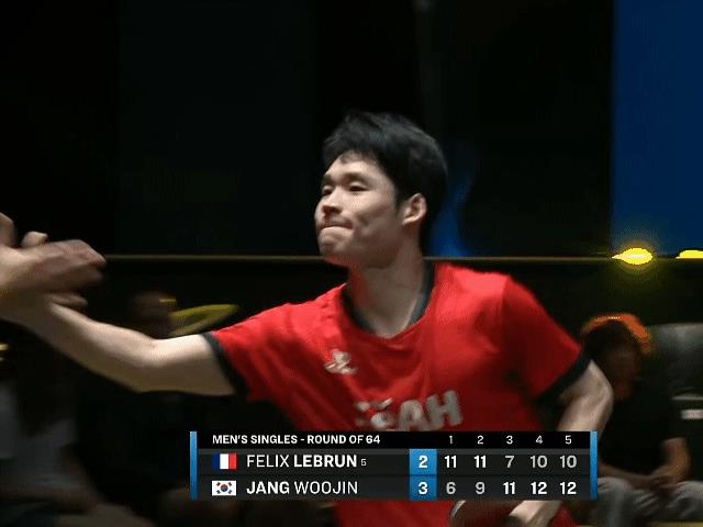爆冷,绝对是爆冷[捂脸], 小勒布伦一轮游了[捂脸][捂脸]! 张禹珍倒地庆祝,小勒布伦跪地懊恼,小勒布伦好像哭了[奸笑]。 五局比分为:6-11,9-11,11-7,12-10,12-10。 小布每次打韩男太艰难了,赢得艰难,输得也很艰难[捂脸],这两站连续输给了安宰贤、张禹珍, 张禹珍实力有的,就是最近挺低迷,这过了小布,看看能不能大补[吃瓜群众]。