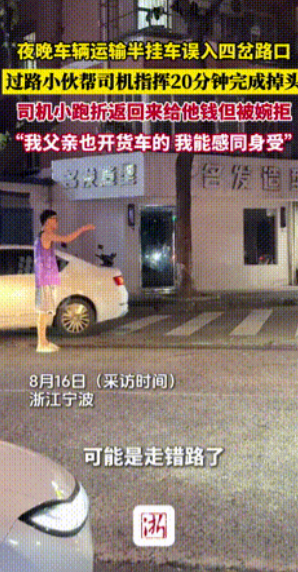 这小伙必成大器!”浙江宁波,一半挂车深夜误入四岔路口,因为路窄车多,司机完全没法掉头!就在他正发愁时,一小伙主动上前指挥20多分钟,最终帮助司机成功掉头!为感谢小伙,司机小跑下车给钱,可没想到小伙直接拒绝,而他接下来的话也让人暖心!网友:这就是中华好儿郎! 深夜的浙江宁波,一条狭窄的四岔路口,一辆半挂车卡在路中间,进退两难,司机试了几次,车身太长,路口太窄,旁边还停着别的车,方向盘怎么打都转不过去。 这要是天亮还好,可大半夜的,路上连个能帮忙的人都难找,司机急得直冒汗,再耽误下去,后面的车越堵越多,搞不好还得叫拖车,那损失可就大了。 就在这时,一个年轻小伙走了过来,他没穿制服,也不是什么工作人员,纯粹就是路过,他看了看情况,二话没说,直接站到车前面开始打手势,示意司机往左打方向,再倒一点。 半挂车司机愣了一下,但看对方指挥得有模有样,就跟着他的指示慢慢调整,小伙一边盯着车尾和路边的距离,一边挥手让旁边停着的几辆车稍微挪一挪,硬是在原本挤得满满当当的路口腾出了一点空间,就这么来来回回调整了20多分钟,半挂车终于一点一点蹭了出来,成功掉头。 司机长舒一口气,赶紧下车,小跑着追上已经准备离开的小伙,从兜里掏出几张钞票就往他手里塞,可小伙摆摆手,怎么都不肯收。 司机急了,说这大半夜的,你帮了我这么大忙,这点钱就当是谢意,小伙笑了笑,回了一句:“不用了,我父亲也是开货车的,我知道你们不容易。”就这一句话,司机当场愣住,眼圈都有点发红,因为开大车的苦,只有同行才懂。 事情被发到网上后,网友全被戳中了,有人说,这才是真正的“中华好儿郎”,不图回报,就凭一颗愿意理解别人的心,也有人感慨,现在社会上不缺看热闹的,缺的是这种愿意主动搭把手的人。 更难得的是,他不是出于做好事的虚荣,而是因为真正理解对方的处境,这份理解比单纯的帮助更稀缺。 评论区聊聊,你觉得,现在社会上最缺的,是愿意帮忙的人,还是能真正感同身受的人?