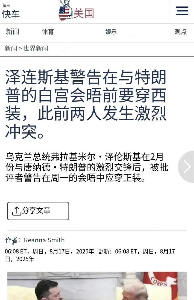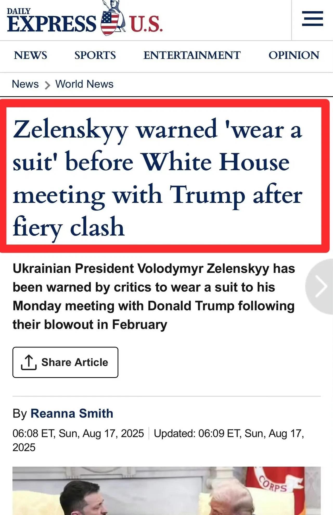 白宫通知泽连斯这次见特朗普必须穿西装,否则就不要来。泽连斯基上次因为没穿西装遭到万斯的批评,引发白宫不满,认为是不尊重特朗普。这次特朗普专门提前告知,如果不穿西装就不用见面。泽连斯基曾表示乌克兰停战后他便会穿上西装,如果这次泽连斯基换上西装,则表示他很可能会屈服特朗普的施压,以结束战争,从某种意义上来说这是双方的一场心里较量。