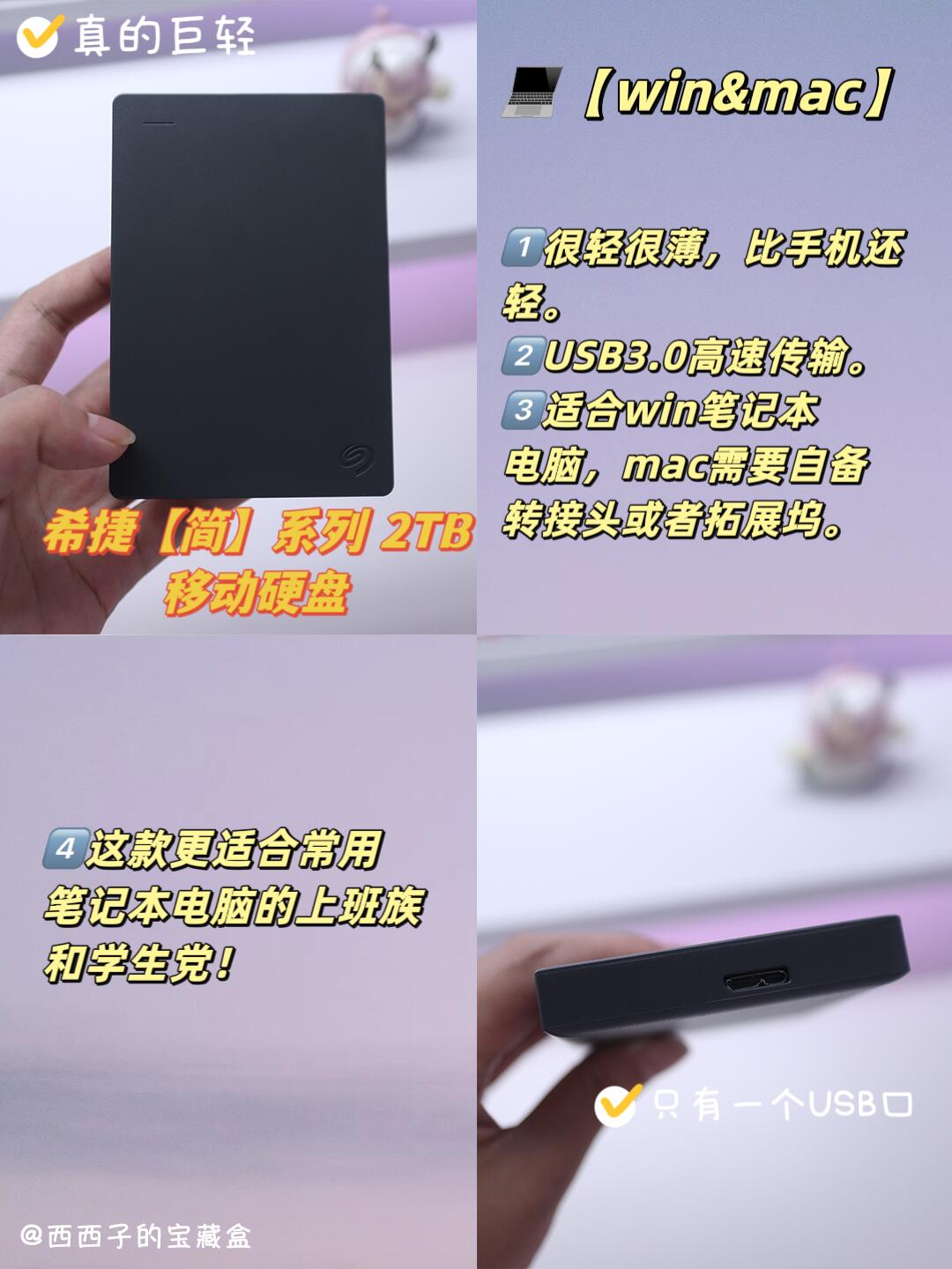 第二个是希捷的【简】经典丁香灰2TB移动固态硬盘,它很轻!!!比iPhone 还轻,外形大小跟NEWQ H3 一样,不过厚度上要薄个三分之一,USB3.0传输,win&mac笔记本通用(但【简】系列只送一根传输线,mac得自备一个转接头或者选【锦】Type-C接口的)。