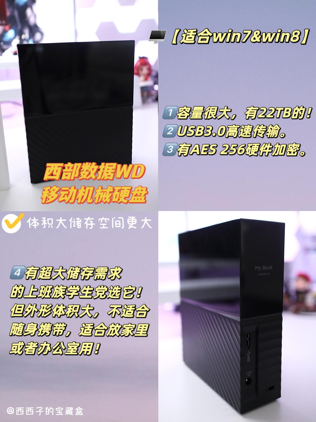 第三个是西部数据WD的移动机械硬盘,超大容量(我选的8TB,但是有22TB的),储存空间大体积也大,适合放家里或者公司用来做台式电脑存储备份,✅有很多大型文件影视音乐的话选它,USB3.0传输,有AES 256硬件加密,安全感满满!