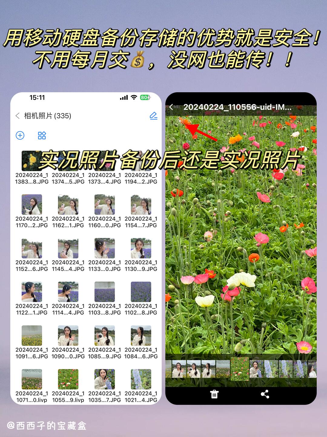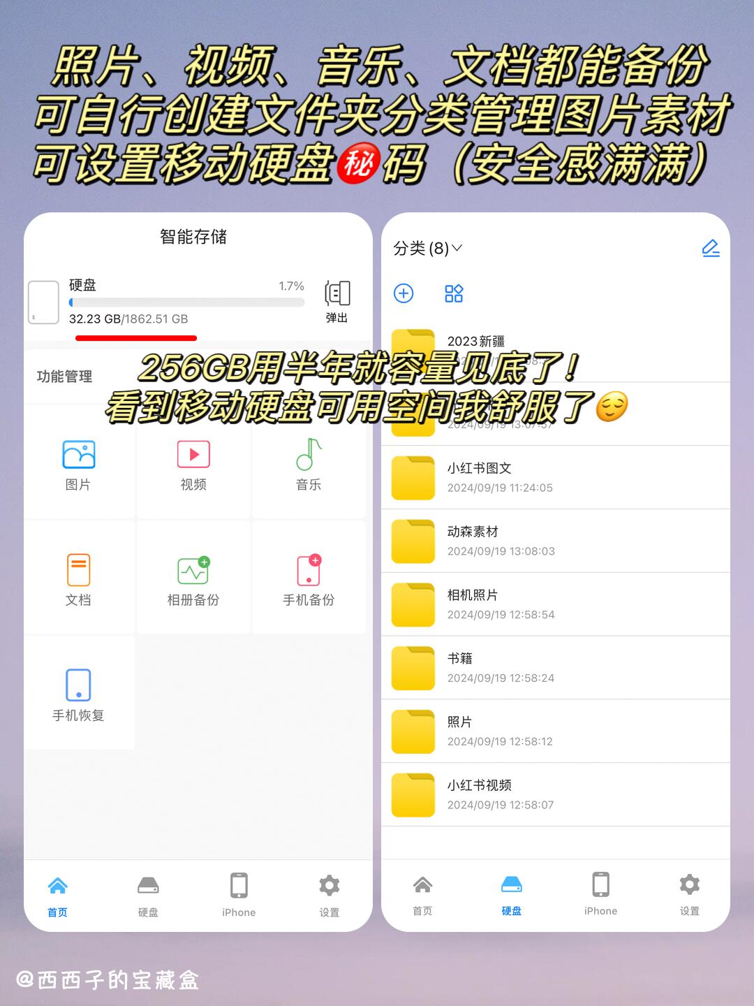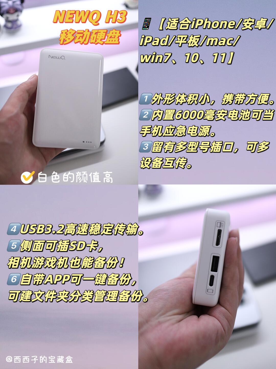 第一个是NEWQ H3 2TB移动硬盘,这也是我使用率较高的一个,国庆假期也准备带这个出去玩,外形跟充电宝差不多大小,🔋有6000毫安电池,出去玩可以当个应急电源给手机充电(⚠️充的慢只能应急用),苹果安卓和win&mac笔记本通用(mac得加转接头或拓展坞),插上USB就能3.2传输,可插SD卡(📷很方便我相机拔卡存图),配合自带的APP可管理分类储存的文件照片。