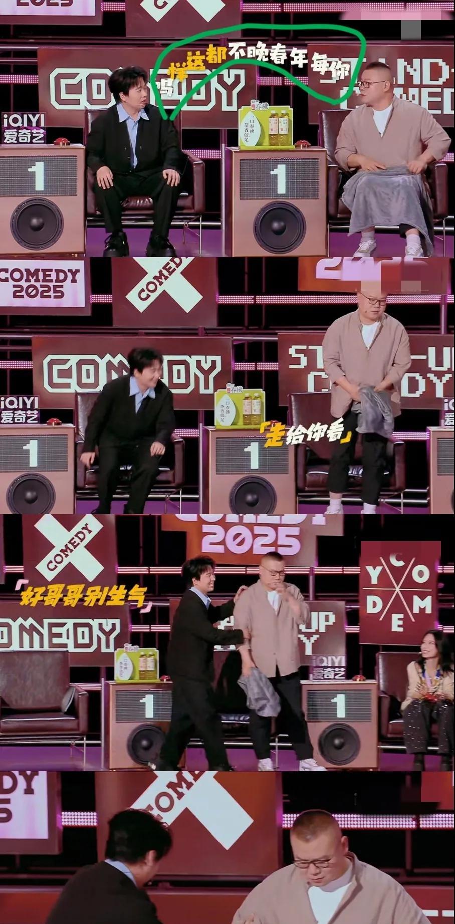 当德云社少班主与德云社“一哥”一起坐上《喜单》嘉宾席,我以为看错了节目。而郭麒麟呛声岳云鹏的这一幕,看的人大呼过瘾! 患有抑郁症的脱口秀演员陈艾表演结束之后,岳云鹏夸赞很喜欢她的风格: 冷酷,从头到尾一动不动。就是你们爱听不听,跟我没关系!(图1图2) 这时,一旁的郭麒麟调侃岳云鹏:“你每年春晚不就这样吗?”(图3) 此语一出,岳云鹏瞬间“花容失色”,好一会说不出话来。只能用假装离席的方式化解尴尬。好在郭麒麟赶忙起身把他拉了回来。 看到这,我想给郭麒麟鼓掌,说的对! 也在想,岳云鹏是真没接住梗,还是他不好意思反驳少班主呢? 而这位少班主并不想接德云社的班,成了郭德纲的一大心病。 最后,反应机敏的主持人庞博说:“最酷的就是,此刻的陈艾仍然一动不动!”完美结束了这场“闹剧”。(图4)