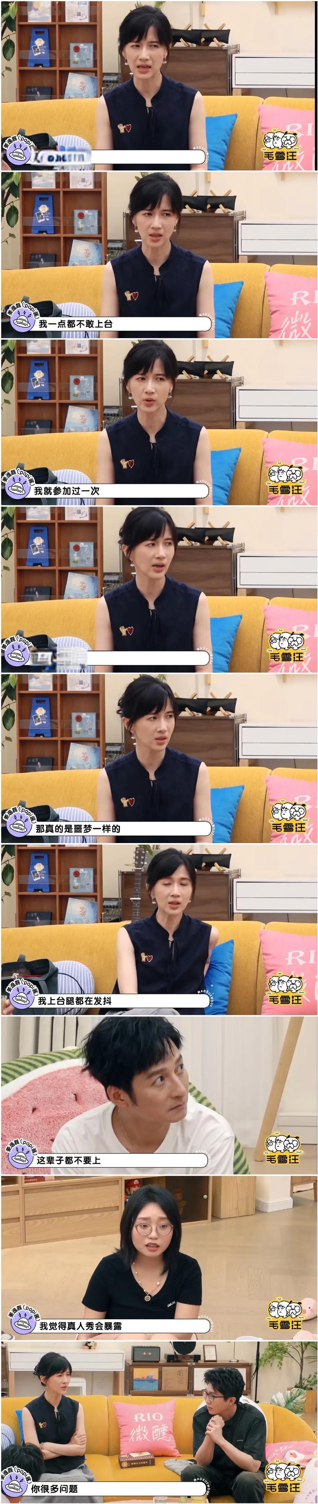 papi酱坚决不录真人秀, 她特别怕上台, 上台腿都在发抖。 她曾参加过《吐槽大会》, 在她角度里, 她觉得就像做了一场噩梦。 我们平常在她的搞笑短视频里, 都觉得她应该是很擅长上 脱口秀这样的节目的, 但是事实与我们想象中相反, 她不敢上台。 她就是适合创作搞笑短视频, 让她直面观众, 她是不适应的, 内心是惶恐的。 这个情况就像有些人就是适合做幕后的, 你突然叫他做幕前工作, 他是不适应的。 papi酱坦言她居然不敢上台, 我真的很大跌眼镜。 开始我觉得她一定是十分擅于语言的人, 那么在脱口秀那样的舞台应该是如鱼得水才对。 但是事实与我们想象中不一样。 她在脱口秀舞台上就像一条鱼到了岸上那么难受。 也许她只适合做剪辑好的内容, 做幕后创作吧。 你说她社恐吧, 她也不是社恐, 她可以录观察室节目, 但是不想录真人秀与舞台节目。 真的搞不懂她到底属于哪类人。 难道她怕别人审视她吗? 她拍短视频也会被审视呀。 短视频里的她不是真实的她。 我明白了, 她是怕观众审视真实生活的她。 她怕她为观众营造的一些人设崩塌 你看房琪不录真人秀 还是千万人追捧的才女, 录真人秀后, 才女人设轰然崩塌, 她一定很后悔参加吧 有些网红真的见光死!