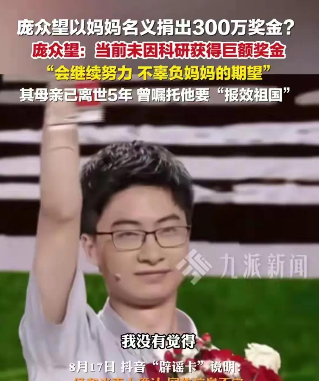 庞众望才是真正的寒门出贵子!希望今后能出现越来越多像他这样的优秀学子来报效祖国,高科技的人才是中国的未来和希望!一个20多岁的年轻人,经历了太多的磨难之后,看到了他的励志,太感动人!少年时代的庞众望家境贫寒,父亲患有精神分裂症,母亲下肢瘫痪,需要坐在轮椅上生活,他本人是先天性心脏病。小小年纪就成了家里的顶梁柱。在这样的情况下也没能阻止他奋斗的脚步,他心中有理想,并且一直在努力,身边还有一位一直鼓励他的妈妈,高考时以744分的成绩被清华录取,本硕博连读,直到清华博士毕业。看完鼻子酸了,命运把苦难撒满他前行的路,他却踩着荆棘播种希望,照顾父母不喊累,清华毕业不逐利,放弃了高薪单位的邀请,偏要留在国内科研实验的第一线,啃科学研究这块硬骨头。这份任性是对精致利己主义者最有力的反驳,是中华儿女最该有的模样!是他刻在骨子里的清醒与担当!别人追的是眼前的繁花,他扛的是心底的星辰,既为家庭撑起一片天,又为祖国守着一寸光。这笑容里的韧性,值得敬佩!比任何高薪都更有重量! 庞众望被评为2024年感动中国年度人物,实至名归。这一份荣耀是对他的鼓励和褒奖,祝福他在未来的事业上一帆风顺!家庭生活幸福美满!他是祖国的好青年,他的母亲也非常了不起,身残志坚为国家培养了这么优秀的儿子。遗憾的是她已经离开儿子5年了。相信众望的妈妈九泉之下也会为儿子骄傲。庞众望这个名字够响亮,果然不负众望!