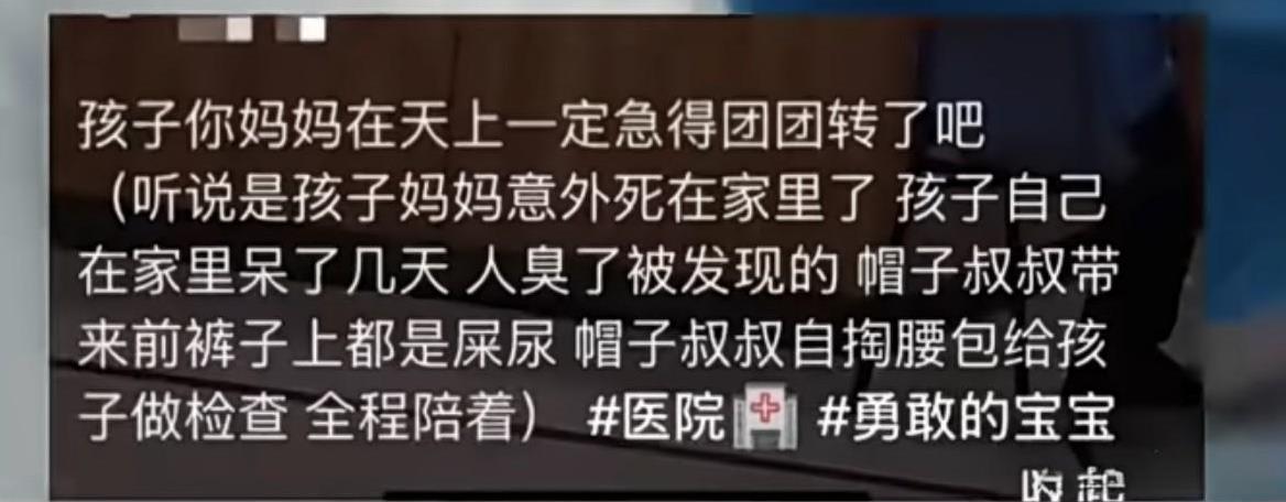 “妈妈什么时候醒?”小小的人儿还不知道什么是死亡,只是单纯的以为妈妈只是睡着了,本能地依赖着妈妈,饿了会叫,却得不到回应,那小小的身影蜷缩在妈妈身边,浑然不知身旁的人早已没了温度。他饿了就拽拽妈妈的衣角,奶声奶气地喊着“妈妈”,回应他的只有空气里渐渐弥漫的陌生气味。那双清澈的眼睛里,还没有“死亡”的概念,只觉得妈妈睡得太久,久到不肯再抱他一下。 邻居推门时的无法言喻的哽咽,警察俯身时的小心翼翼,都藏着对这弱小生命的疼惜。他们凑钱带孩子去检查,轻声哄着他别怕,笨拙地学着冲奶粉,用粗糙的手掌擦去他脸上的泪痕。这些素不相识的人,用细碎的温暖织成一张网,接住了这个突然坠入黑暗的孩子。愿他后来的日子里,总有光照进来,有人告诉他“妈妈变成了星星”,有人替妈妈牵起他的手,慢慢走,稳稳长。#婴儿呼唤妈妈# #妈妈这一刻#