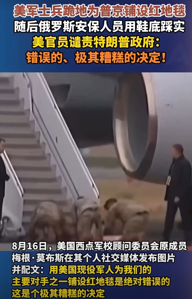 美军士兵跪地为普京铺设红地毯,俄罗斯安保人员用脚踩实。这画面,难怪美国人有意见。