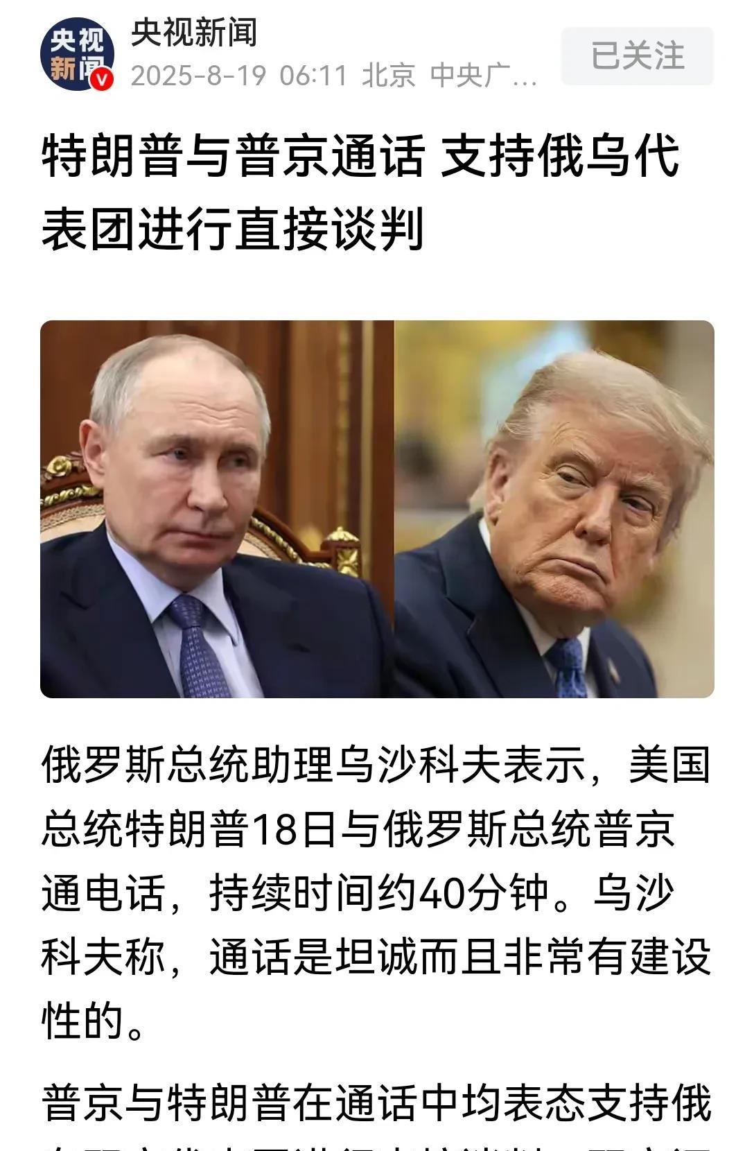特朗普直接叫停了,跟欧洲官员们的多边会晤! 让大家伙先等等,他要先去给普京做个汇报! 据欧洲媒体以及央视综合报道,美国当地时间8月18号下午,特朗普和多位欧洲领导人进行了第2轮会晤! 第1轮是先单独跟乌克兰代表的会谈! 谈的差不多了,才把欧洲的领导人叫进去,进行第2轮多边的会晤。 结果就在会议开到一半的时候,特朗普突然暂停了会议,他要给普京打个电话! 随后俄罗斯乌沙科夫对媒体表示,总统普京确实接到了特朗普的电话! 双方交谈了大概40分钟! 最后俄乌双方都表示愿意进行俄乌双方之间的直接会谈! 其实这个电话很简单,特朗普在白宫逼着泽连斯基和欧洲领导人表态! 普京的条件你们答应不答应? 我已经给你们争取了,普京已经做出巨大的让步了! 眼下这个条件就是普京的底线,你们答不答应? 如果答应的话,我就可以邀请普京进行三方会谈! 很有可能泽连斯基和欧洲领导人被迫屈服了! 然后特朗普马上就给普京打电话汇报了这一情况,并询问普京,你愿不愿意参加三方会议? 好了,最后的结局应该是三方都点头了! 那么最大的可能就是本月底之前,乌克兰美国俄罗斯将举行高层的三方面对面会晤! 地点还不确定!