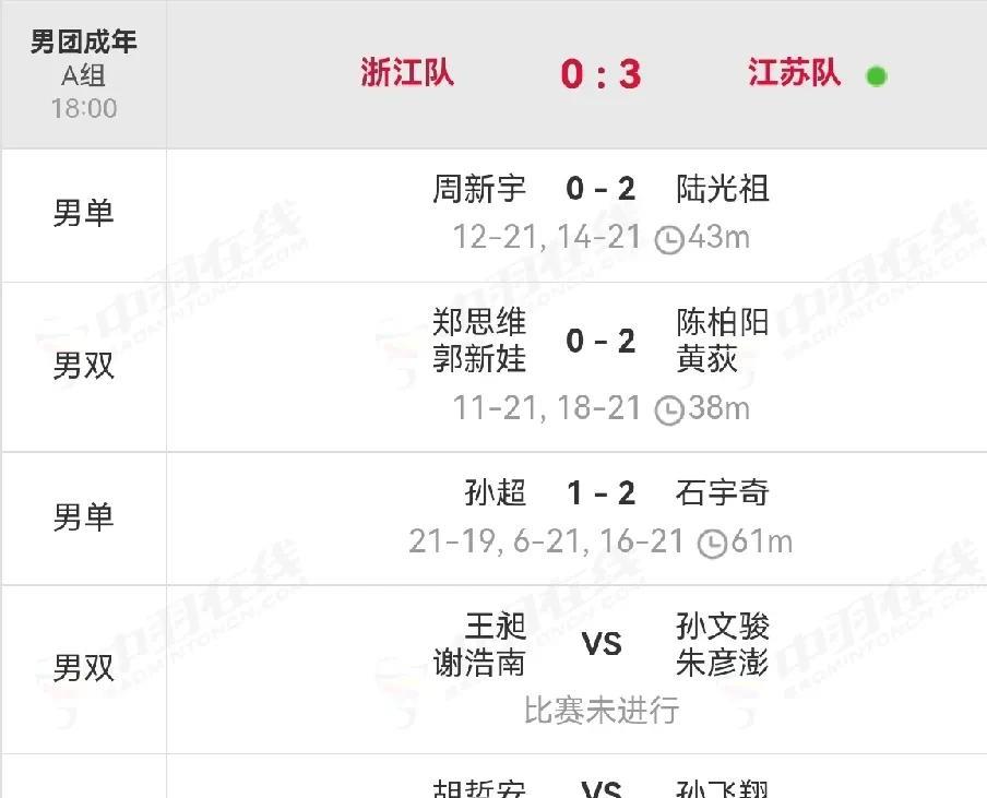 2025年第十五届全国运动会羽毛球赛团体资格赛男团成年组比赛中,石宇奇19-21,21-6,21-16逆转战胜孙超,江苏队3-0战胜浙江队,江苏队,浙江队携手晋级。