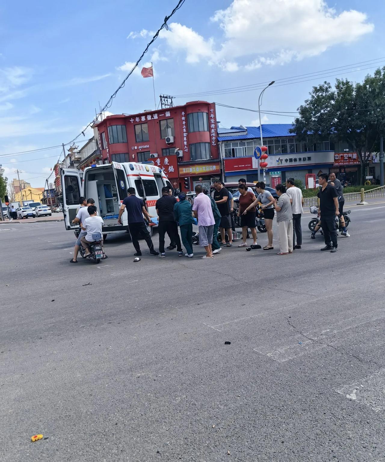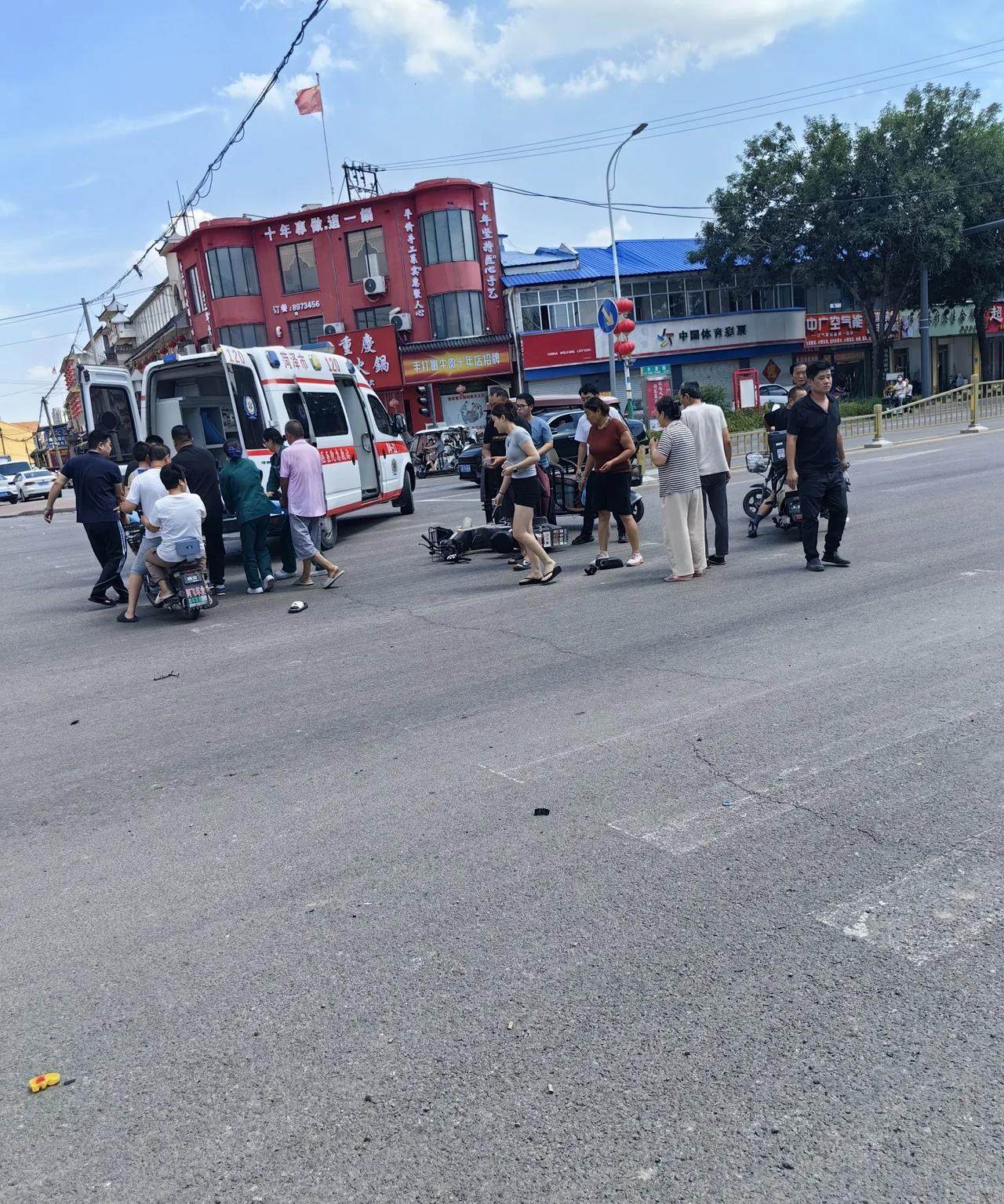 刚中午一点多发生的,又是闯红灯惹的祸,一个年轻小伙骑的电两轮,和一个骑电三轮的撞