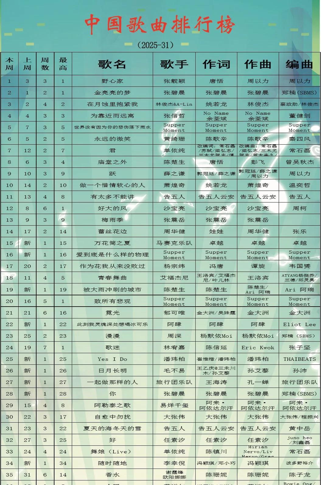 必看!2025年第31期中国歌曲排行榜揭晓 乐坛风云变幻,最新一期中国歌曲排行榜火热出炉!谁的新歌强势登顶?又有哪些黑马突出重围?从实力唱将到新兴歌手,这里有你不容错过的音乐风向标,快来看看有没有你单曲循环的那首!