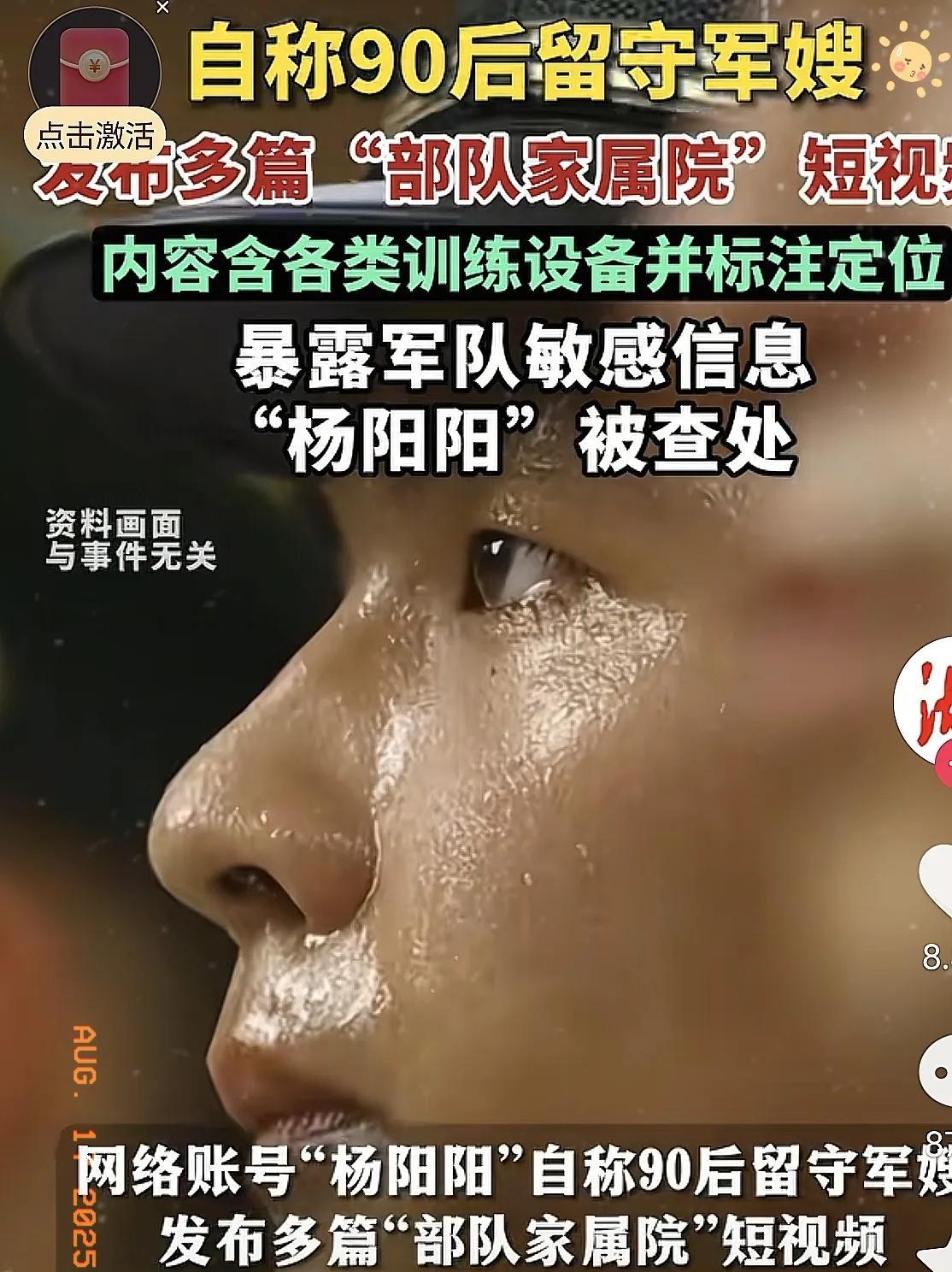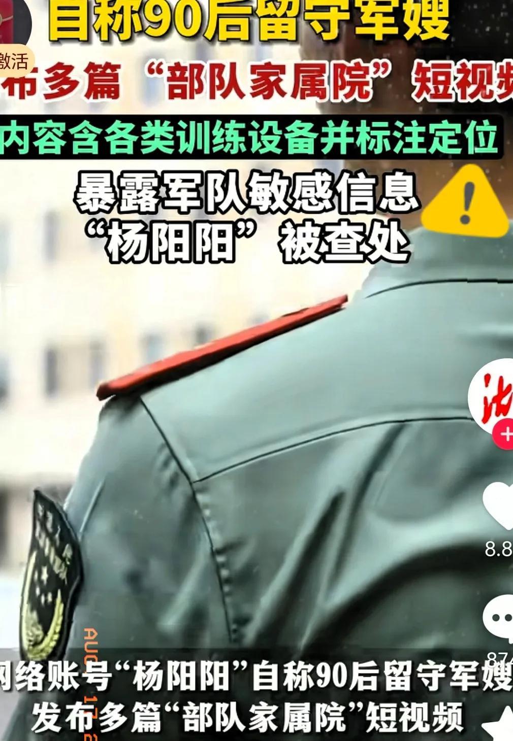 军嫂阳阳姐因为泄密事件火遍全网,但最受影响的并不是阳阳姐,也不是他老公,而是她老公的战友们。 信源:极目新闻——自称90后留守军嫂,暴露敏感信息!账号“杨阳阳”被处置 一个手机屏幕上的定位红点,打破了虚拟世界与现实军事禁区的隔离墙。 这个红点,发布者是90后军嫂杨阳阳,她社交平台上的一个地理标签,却最终变成了一个可能被敌方利用的精确打击坐标。 杨阳阳是网络上小有名气的“阳阳姐”,她精心打造的“留守军嫂”人设,让她收获了不少粉丝。 在她的视频里,生活总是“幸福感溢出屏幕”,而这份幸福的背景,正是她丈夫所在的部队家属院。 为了维持热度,她的镜头越来越大胆。从营区大门到内部路牌,从小卖部招牌到训练场的单双杠、障碍架,都成了她视频里的“风景”。 她甚至开启了地理定位,将这个敏感坐标公之于众。视频背景里,部队清晰的集合哨声,也成了她分享“军营生活”的一部分。 朋友的提醒被她当作耳旁风,虚荣心与流量变现的诱惑,让她彻底忽视了保密规定。 这份看似甜蜜的日常,很快引爆了一场毁灭性的风暴。丈夫被部队查实后,责令立即提前退役,原本唾手可得的转业安置与百万级退伍费化为泡影。 对杨阳阳个人的惩罚是社交账号被依法封禁,但对她丈夫所在部队的冲击才刚刚开始。 整个单位遭到全军区通报批评,上级派驻工作组进驻,一场“戒严”般的整顿开始了。所有官兵的休假、外出资格被立即取消,手机被统一收缴并逐一检查。 官兵们被迫参加高强度的思想教育和保密学习,一遍遍手写思想汇报和检查。这场由杨阳阳一人引发的灾难,最终由她丈夫的全体战友用自由和安宁来买单。 事件的根源,在于杨阳阳对“军嫂”这个身份的认知错位,她没能分清荣誉身份与网红角色之间的边界。 在她的账号里,“90后留守军嫂”这个标签,她不仅收获了关注,还做起了带货生意,睡衣、零食都成了她流量变现的商品。 当有人提醒她注意保密时,她甚至理直气壮地反问:“我老公保家卫国的,我晒生活咋了?”这种逻辑,与真正军嫂们的行为准则形成了鲜明对比 在宁夏,有一位名叫李春雪的军嫂。她的丈夫长期戍边卫国,家中老人需要照顾,孩子需要抚养,所有的重担都落在了她一个人身上。 但她从未抱怨,不仅在家庭中尽职尽责,还在工作中表现突出,成为了一名优秀的教师,用自己的行动诠释了军嫂的担当。 在河北衡水,张佩素和陈卓两位军嫂的故样同样令人动容。张佩素作为教师,坚守三尺讲台,用知识和爱心培育学生,同时全力支持丈夫戍边卫国。 陈卓则在丈夫赴藏戍边期间,独自撑起家庭,她不仅感受到了社会的关怀,还将这份温暖传递给更多的人。 门头沟区的“军嫂大课堂”更是为军嫂们提供了一个成长和发展的平台。这里不仅有职业技能培训,还有情感交流和互助成长的机会。 许多军嫂通过这个平台找到了工作,实现了自我价值,还积极参与社会公益活动,形成了“京西红嫂”的美丽风景线。 这些军嫂的故事,展现了她们的自立自强和无私奉献。相比下来,杨阳阳实在是德不配位 杨阳阳可能从未想过,自己发布的那些零碎信息,在专业情报人员眼中意味着什么。军事专家分析,境外情报机构最擅长的就是“拼图游戏”。 通过她视频里未打码的训练器械,可以分析部队的训练强度和装备水平;通过营区布局和路牌,可以绘制出内部地图;而那个精确的地理定位,更是直接暴露了核心目标。 这种利用公开信息进行情报分析的手段,并非什么新鲜事。 历史上最著名的案例莫过于珍珠港事件前,日本间谍就是通过分析夏威夷当地报纸上刊登的美军官兵婚礼、社交活动等公开信息,精准掌握了太平洋舰队舰艇的在港规律。 如今的社交媒体,让这种信息搜集的效率提高了千百倍。 2025年8月14日,“网信中国”的官方通报,将杨阳阳的行为定性为“暴露军队敏感信息”的违法违规案件。 这场风波的最终结局,是一场彻头彻尾的悲剧。杨阳阳的网红梦碎了,她丈夫的军旅生涯和人生规划被彻底打乱,一群无辜的年轻战士失去了本该拥有的正常生活。